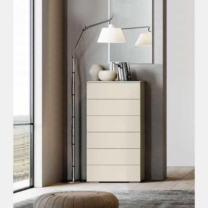 Il mobile d'arredo è disponibile in una vasta gamma di finiture da accostare a quelle della vostra stanza. Il settimino come in foto è disponibile in finitura Orzo. Rispetto agli altri settimini di questa collezione, questo non permette un mix di finiture scocca e frontali. I 6 cassetti hanno un'apertura a presa laterale, una scelta pensata ai fini dell'estetica.