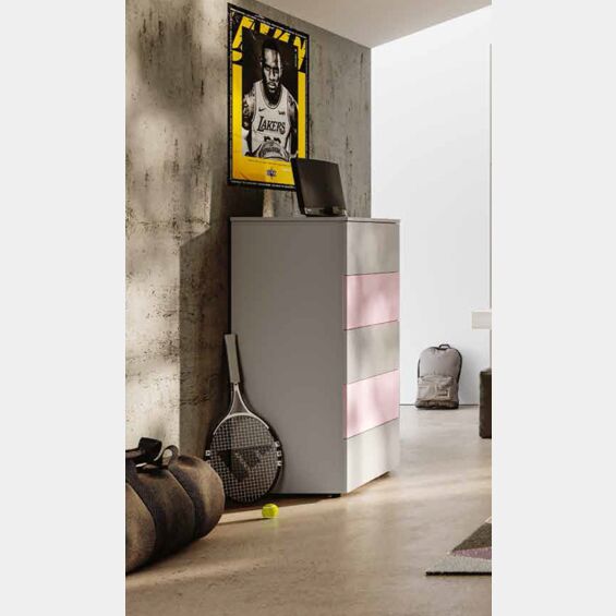 I 5 capienti cassetti assicurano un notevole spazio di appoggio per tutti gli oggetti utilizzati in camera da letto. Le finiture proposte sono Bianco altea per la struttura, Grigio seta e Rosa confetto per i frontali. Grazie all'ampia gamma di finiture disponibili è possibile personalizzare il comodone per adattarlo al meglio alla propria camera.