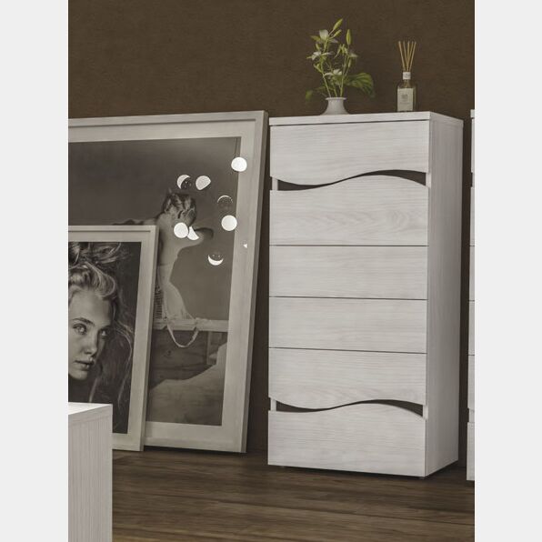 Settimino moderno 6 cassetti, in finitura Olmo Bianco con dettagli grigio fango che formano un particolare ed elegante movimento a onda nei cassetti che rende il settimino di design e adattabile a ambienti moderni.