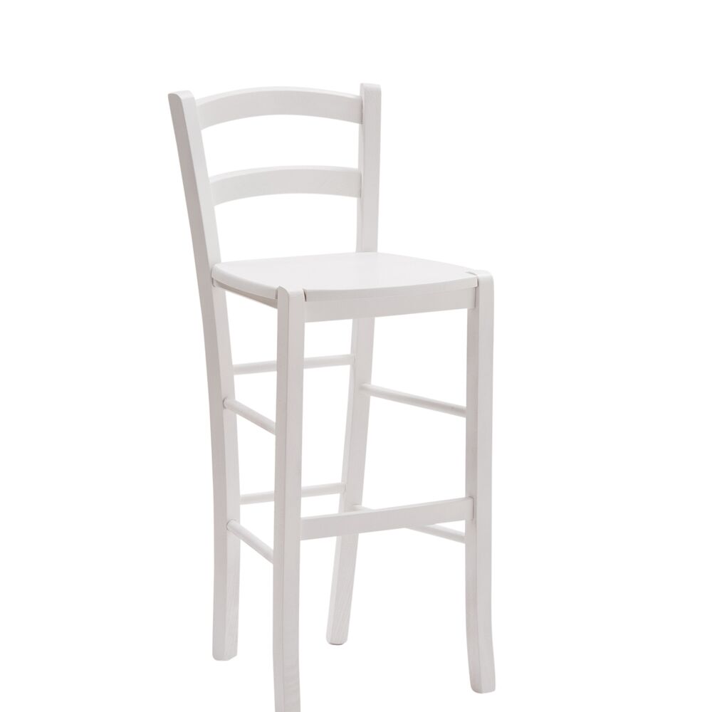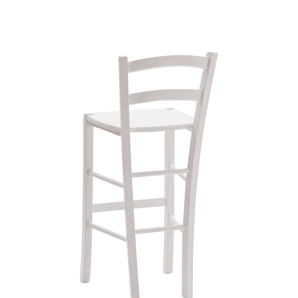 Lo sgabello è in finitura laccato bianco, il fondino è in legno, l'altezza della seduta misura 73 cm.