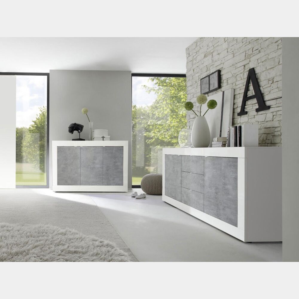 Soggiorno completo, formato da Madia 3 ante e Credenza 2 ante 3 cassetti in finitura bianca lucida e Cemento.