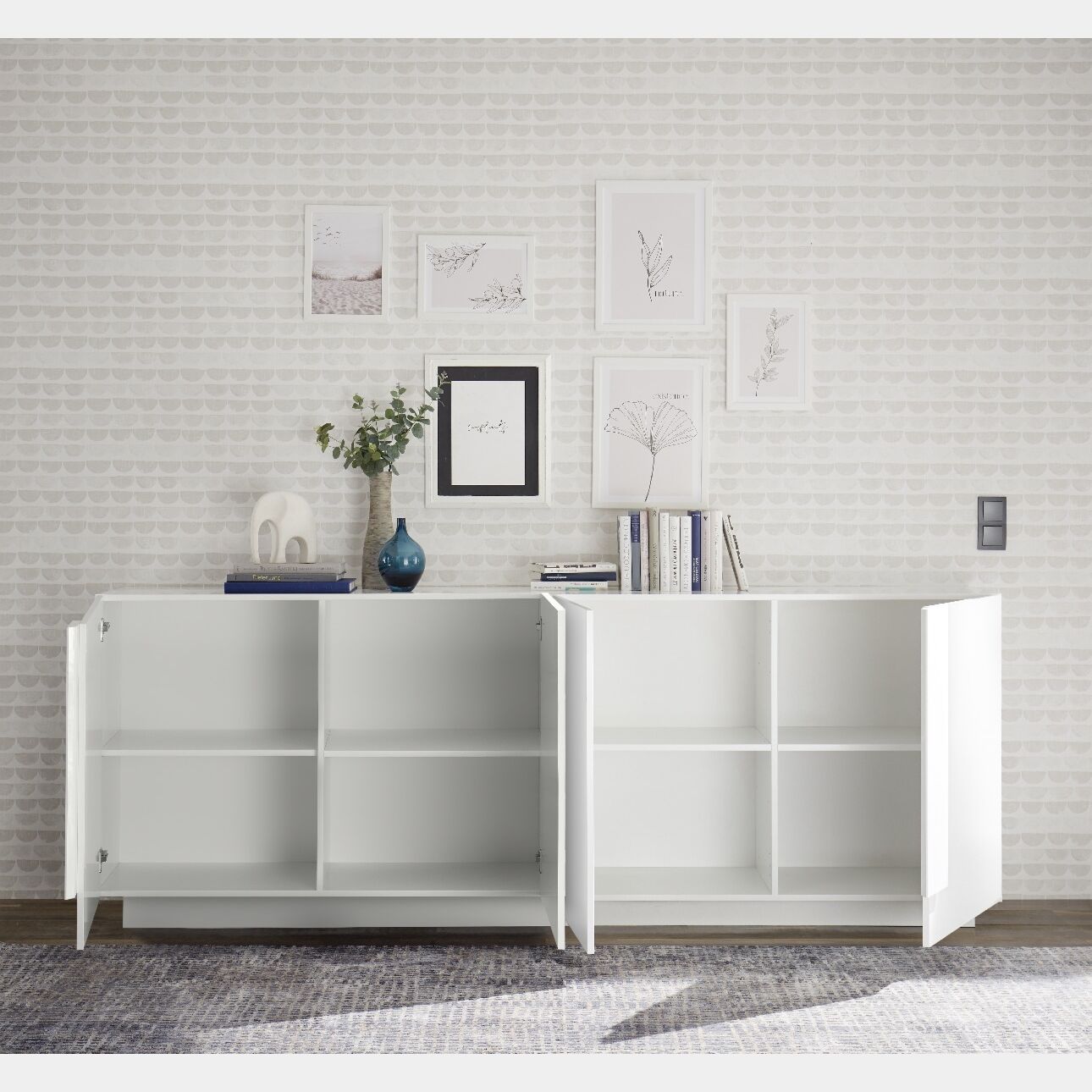 Il soggiorno moderno presenta un'elegante finitura in Bianco laccato lucido, colore di tendeza degli ultimi anni. Il soggiorno è composto da una colonna a 2 ante, una credenza a 4 ante ed un tavolo. Come optional è possibile richiedere le sedie.