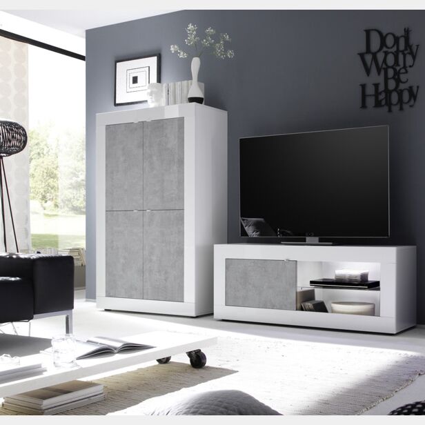 Soggiorno completo "Beta", solo come in foto, in Bianco laccato lucido e Cemento, composto da Madia Alta e Porta TV.