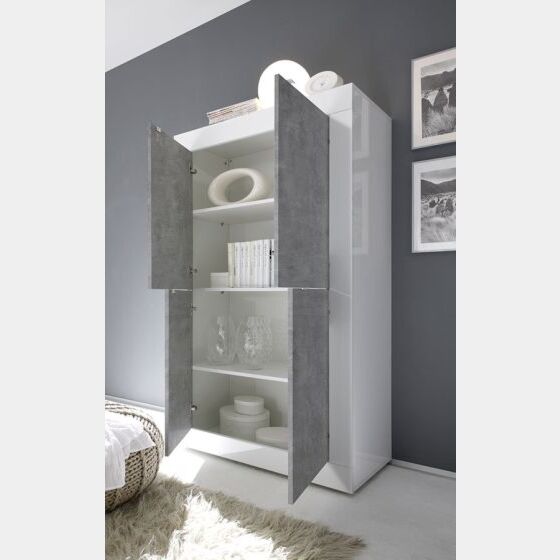 - Madia "Beta" moderna e di design, realIzzata in melaminico e con una finitura legno di alta qualità, questa madia alta dalla linea moderna e attuale viene proposta con una finitura in pregiato laccatura Bianco e Cemento. Molto spaziosa e capiente, grazie all'ampia dimensione di profondità, può contenere anche oggetti di grandi dimensioni.