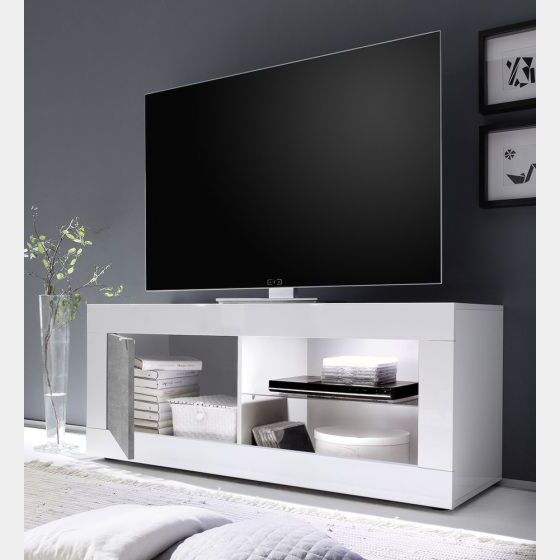 - Porta TV "Beta" moderna e di design, realizzata in melaminico e con una fInItura legno di alta qualità, questo porta tv dalla linea moderna e attuale viene proposto con una finitura in pregiata laccatura bianco lucido e Cemento. Molto spazioso e capiente, grazie all'ampia dimensione di profondità, può contenere anche oggetti di grandi dimensioni.Presenta 1 ante in legno sul lato sinistro e due ampie zone a giorno al a destra divise da un ripiano in vetro dove poter riporre decoder, dvd, telecomandi, ecc.