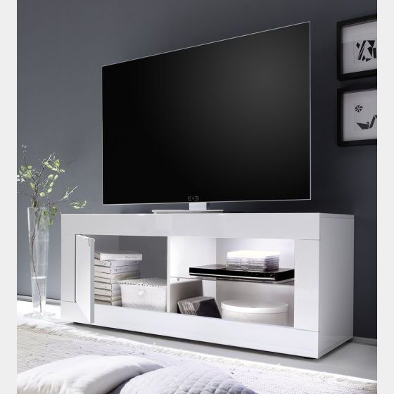 - Porta TV "Beta" moderna e di design, realizzato in melaminico e con una finitura legno di alta qualità, questo porta tv dalla linea moderna e attuale viene proposto con una finitura in pregiata laccatura bianco lucido. Presenta 1 ante in legno sul lato sinistro e due ampie zone a giorno a destra divise da un ripiano in vetro dove poter riporre decoder, dvd, telecomandi, ecc.