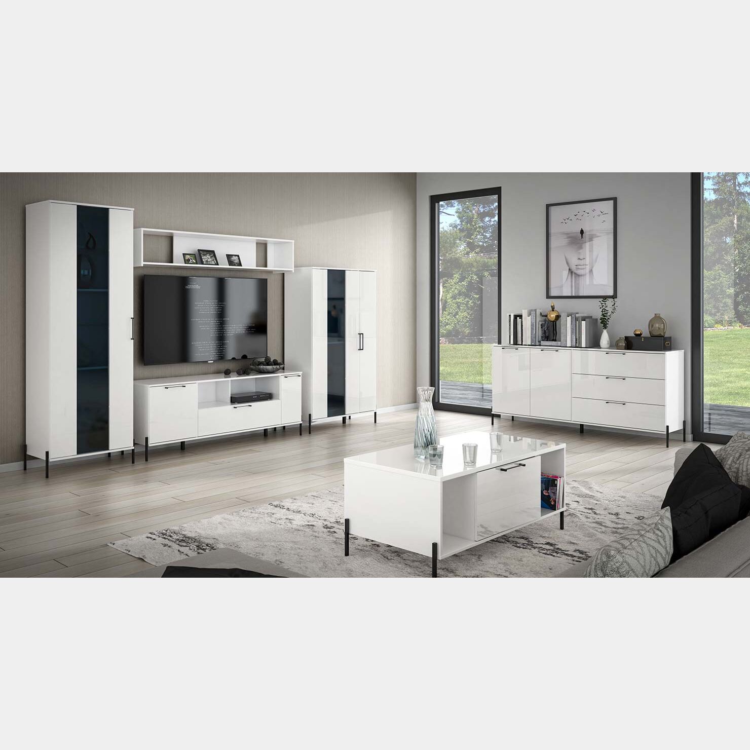 Il soggiorno completo presenta un design semplice ma di impatto: i particolari piedini in metallo nero richiamano le maniglie di ante e cassetti. la finitura di frontali è Bianco lucido mentre la struttura è in opaco.