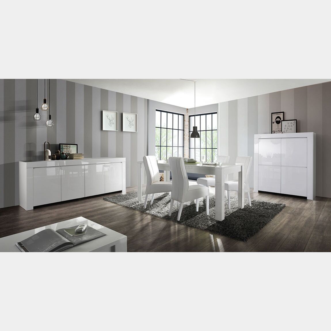Soggiorno completo, solo come in foto, finitura bianco laccato lucido.La sala è composta da Credenza, Madia Alta e Tavolo.