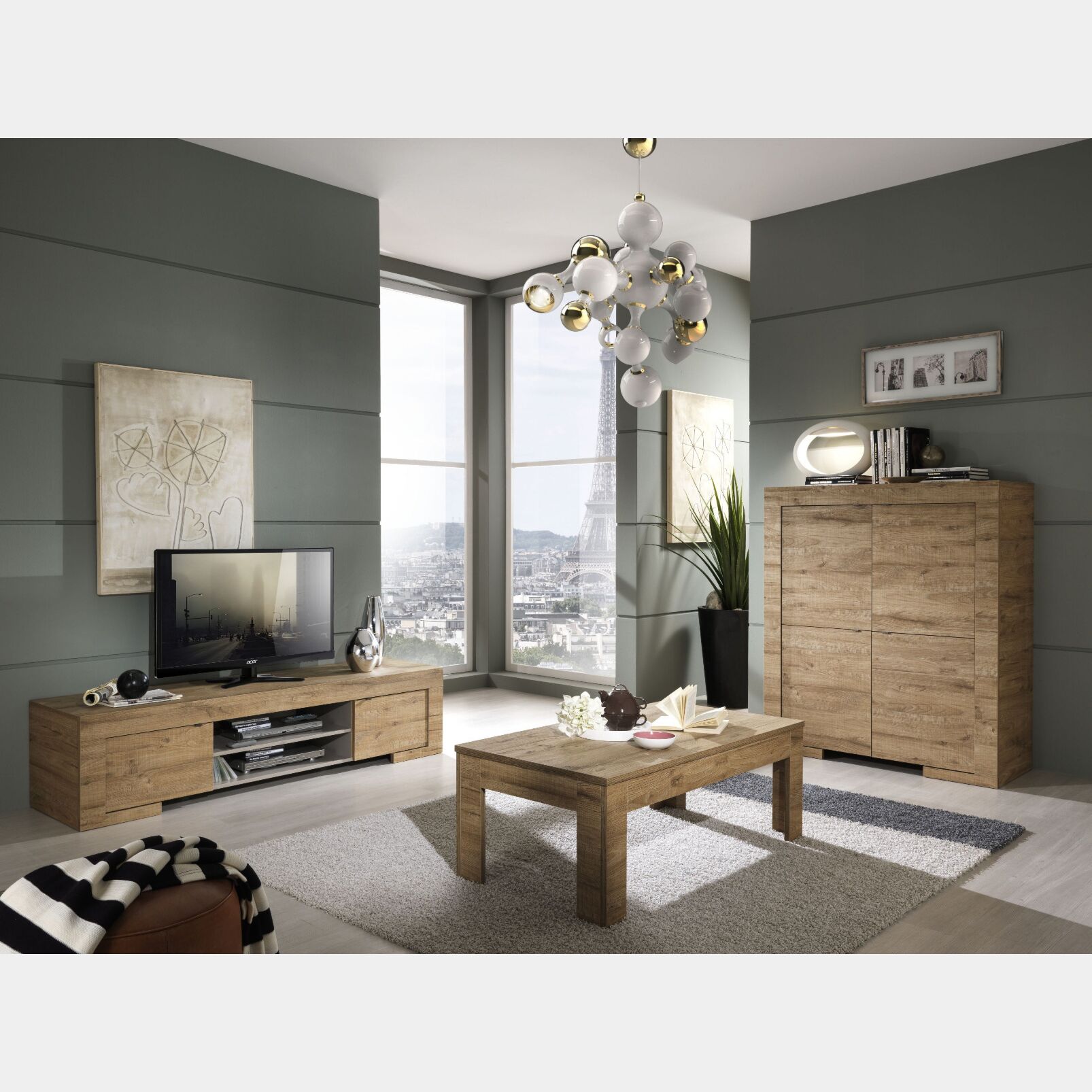 Soggiorno completo, solo come in foto, finitura rovere miele. La sala è composta da Porta TV, Credenza e Tavolino.