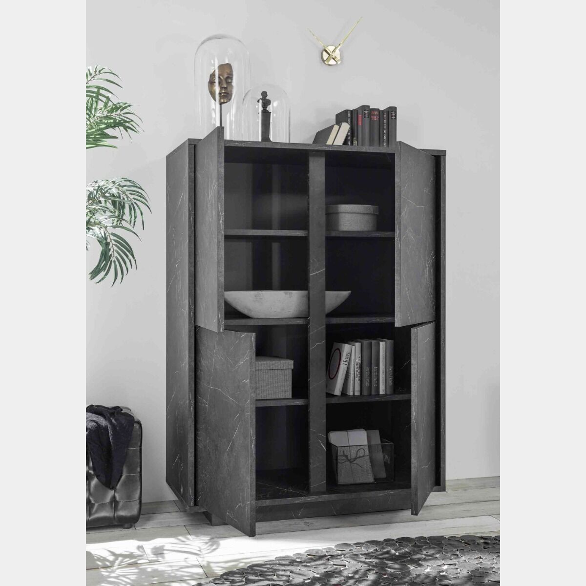 Con la sua finitura in effetto marmo nero di carrara, l'arredo giorno riesce ad unire l'eleganza dello stile classico a delle linee vicine allo stile moderno. Il mobile MADE IN ITALY è strutturato con 4 ante battenti con cerniere in metallo, mentre all'interno della Madia con effetto marmo di carrara ci sono 2 ripiani che coprono tutta la lunghezza dei due vani a 2 ante e una finitura nera opaca.