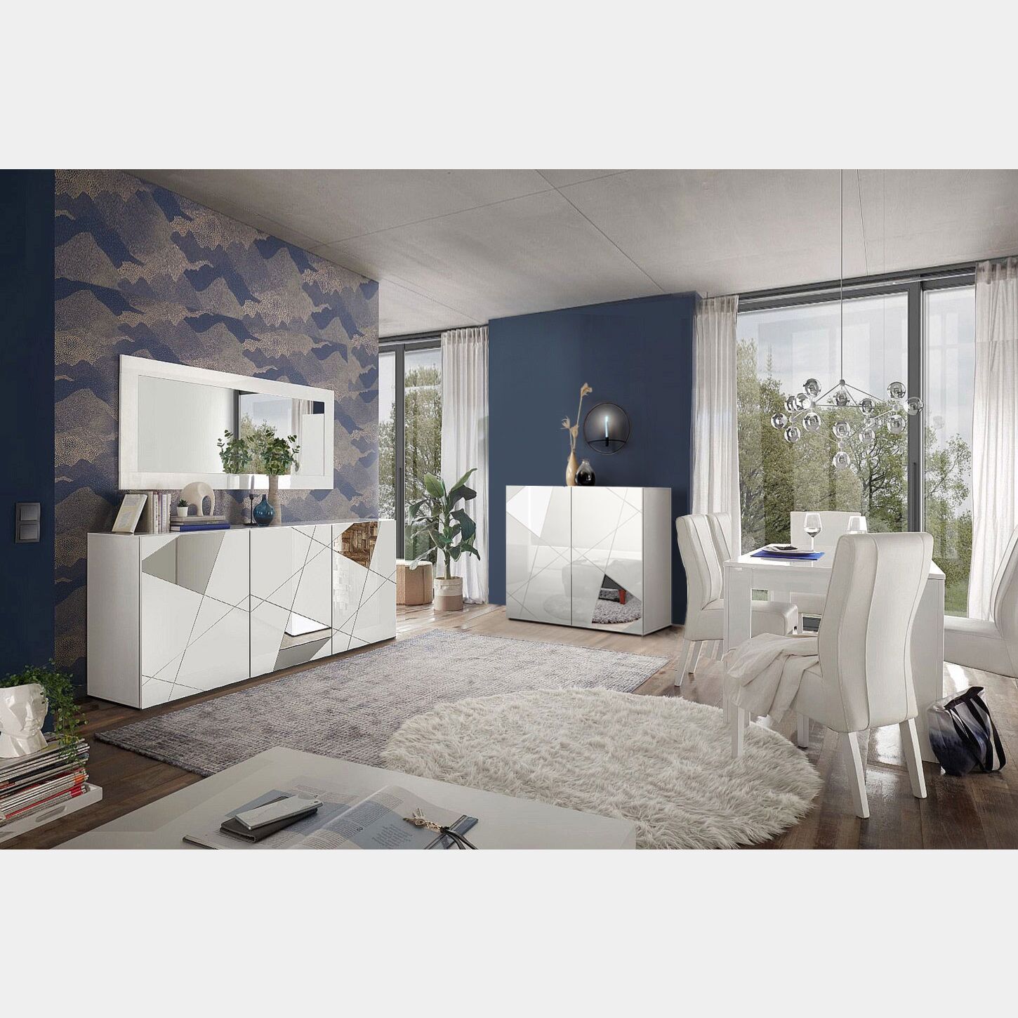 La madia presenta un design estremamente moderno e di tendenza, le ante sono dotate di numerose linee che creano disegni geometrici, in alcuni di questi viene incassato uno specchio lucido in rilievio, il risultato è accattivante e innovativo. La madia presenta 3 ante battenti, la finitura è in bianco lucido, è presente un ripiano e un divisorio centrale per vano, la suddivisione dello spazio garantisce un ampio piano di appoggio, essenziale nell'utilizzo quotidiano.