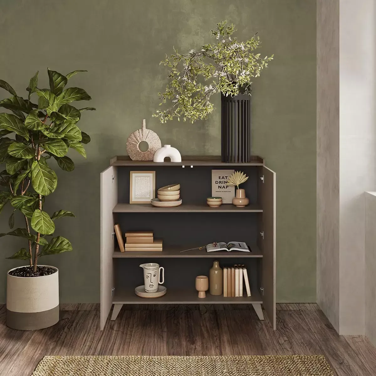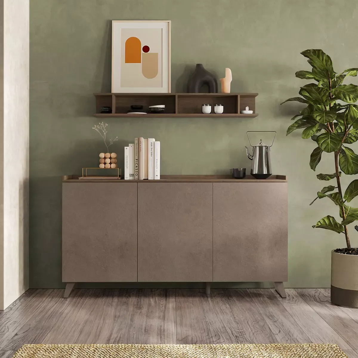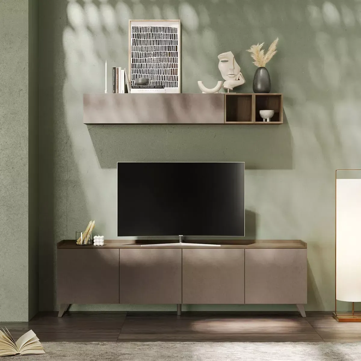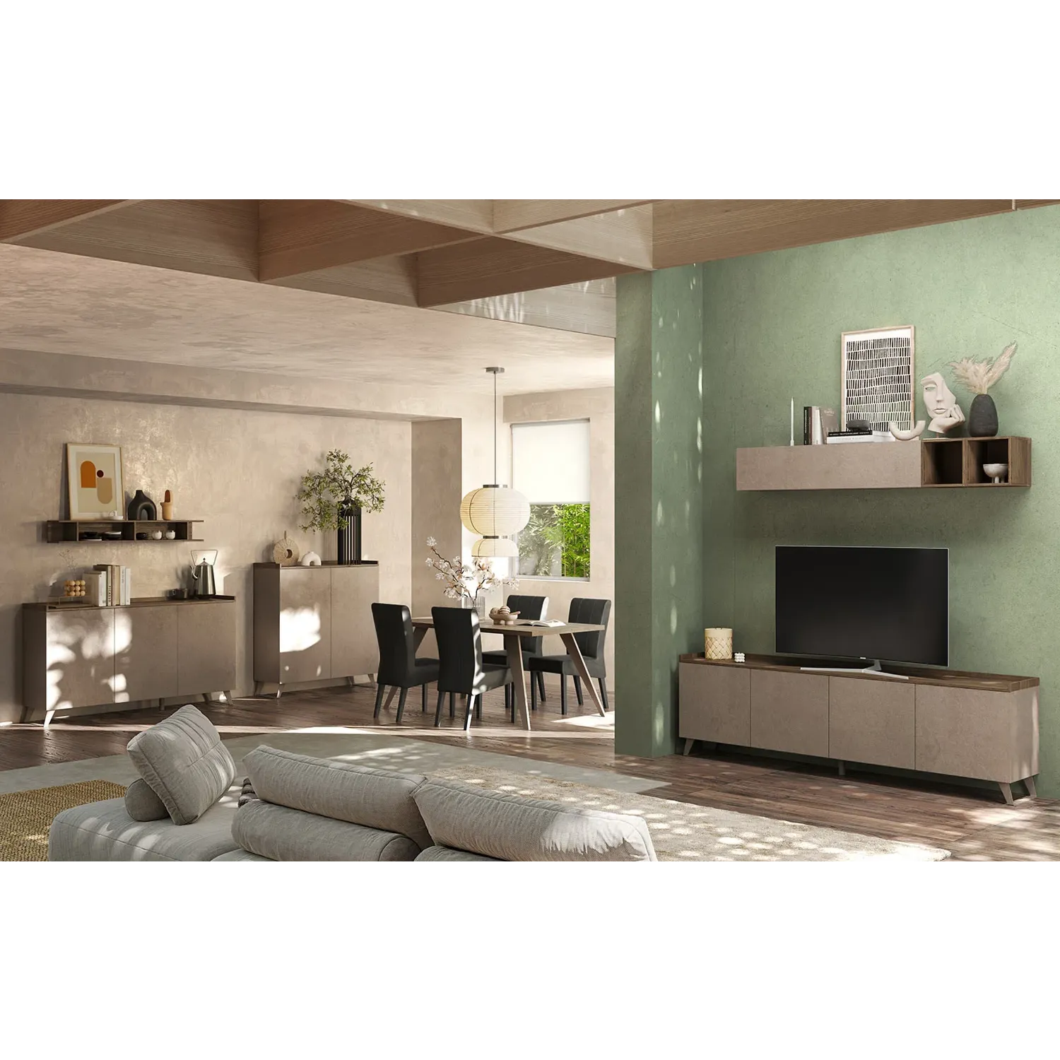 Il design moderno e lineare del soggiorno offre un arredo leggero e pulito, caratterizzato da elementi ricercati che lo valorizzano, come il top dei contenitori a contrasto ed i piedini a cono. Le finiture Bronzo e Mercure creano un piacevole contrasto per risaltare al meglio la linea di ogni mobile.