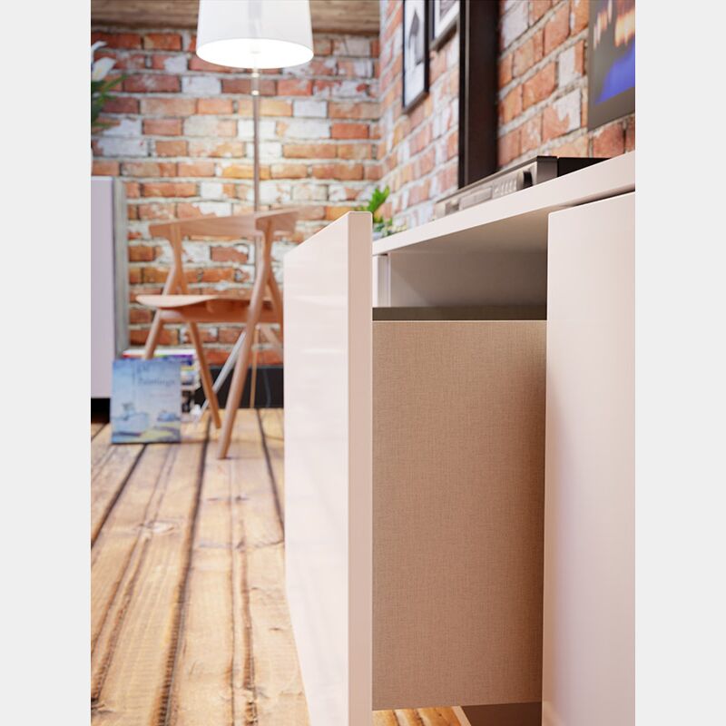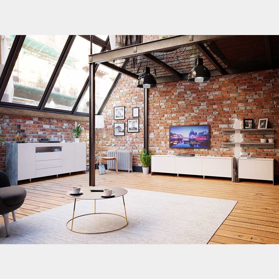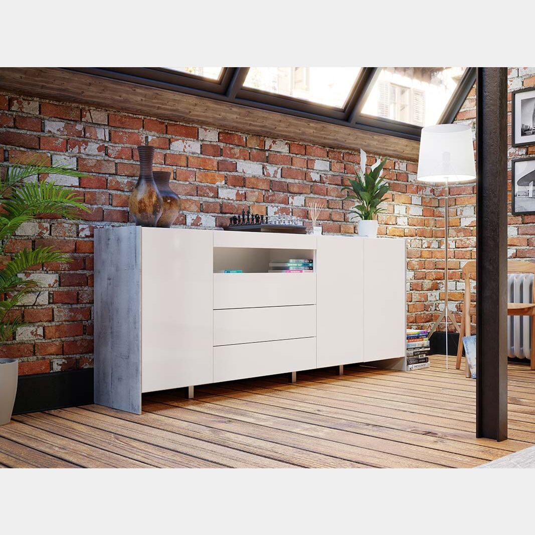 Il soggiorno presenta uno stile originale e innovativo, capace di arredare con personalità l'ambiente offrendo al contempo un ampio spazio di appoggio. Il Bianco lucido presente nei frontali sovrasta la finitura dei fianchi in Grigio loftwood, questa contrapposizione di tonalità assicura un mobile capace di personalizzare la stanza.
