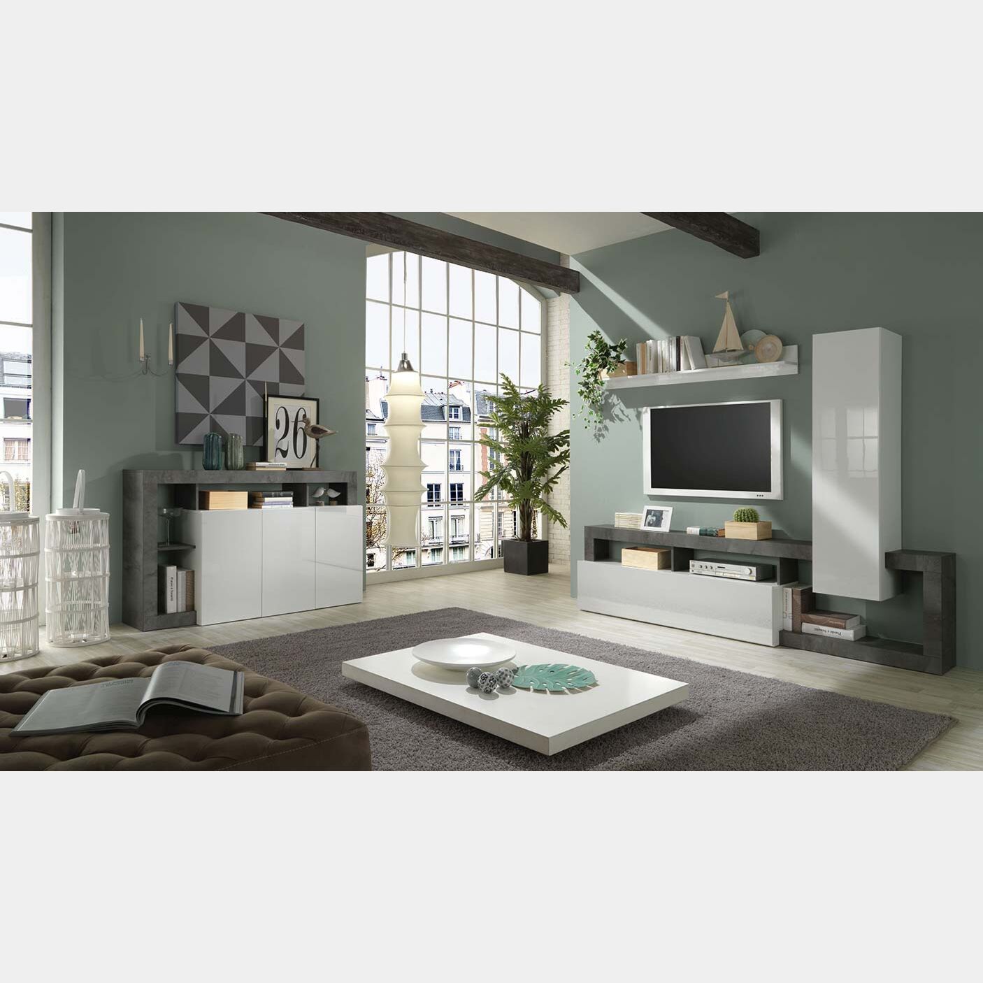 Soggiorno moderno composto da parete attrezzata e madia a 3 ante in finitura bianco e ossido
