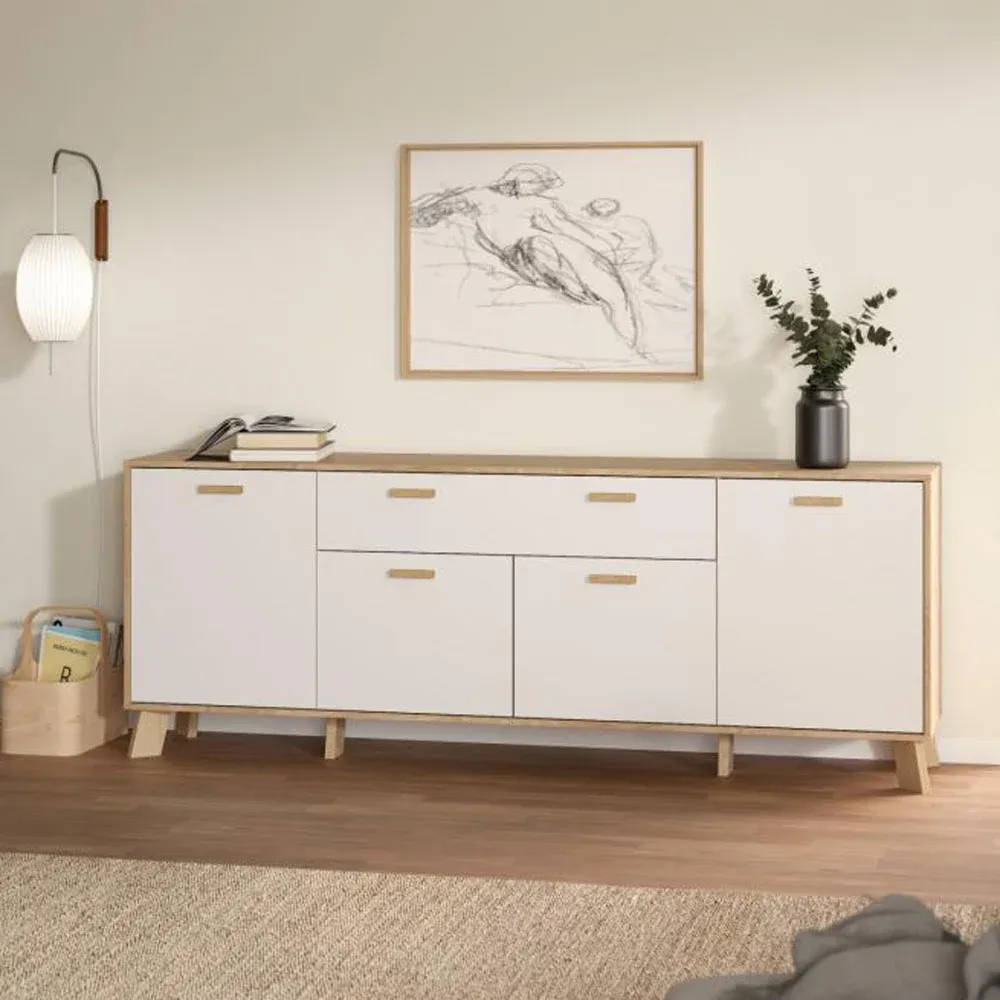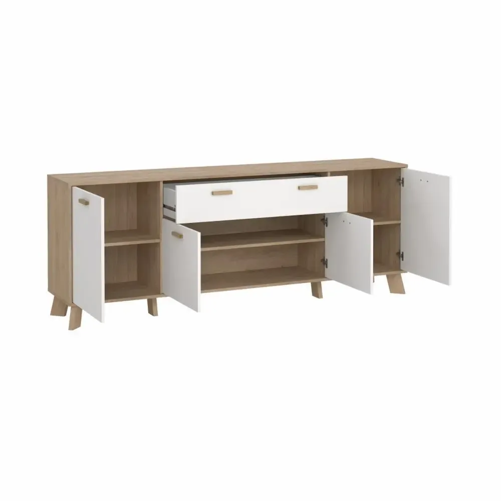 -Una madia orizzontale composta da un cassetto, da tre ripiani e da quattro ante battenti. A dare un tocco di eleganza e di calore alla credenza sono i piedini e le maniglie.