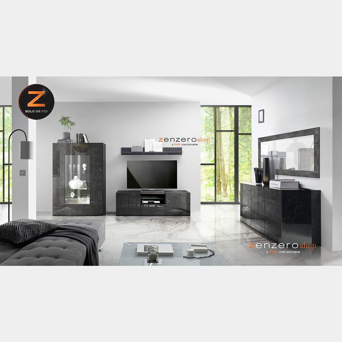 Soggiorno moderno Marmo Lucido Nero di Lusso con Porta TV, Madia e Vetrina