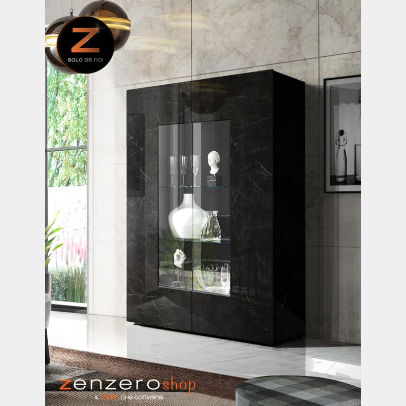 La composizione per soggiorno in finitura effetto marmo nero proposta da ZenzeroShop fa parte della nuova Collezione Diamante. Con le sue venature bianche su fondo lucido nero, gli arredi zona giorno riescono ad unire una finitura dallo stile classico con delle linee più moderne. I mobili di lusso MADE IN ITALY della composizione sono tre: