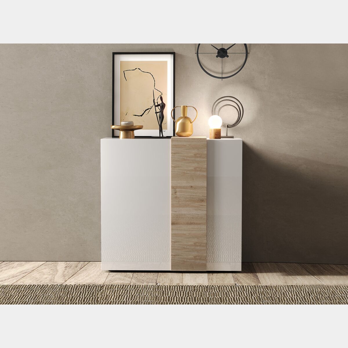 La madia bassa ideata per la nuova collezione "Mobili Strip" di ZenzeroShop unisce due finiture moderne come il Rovere Kadiz e il Bianco Lucido. Lo stile della madia per sale da pranzo si accosta molto bene ad un arredamento sia moderno che industriale. La Madia è dotata di due ante battenti, che una volta aperte mostrano un interno chiaro e spazioso, ben suddiviso da un tramezzo e due ripiani.