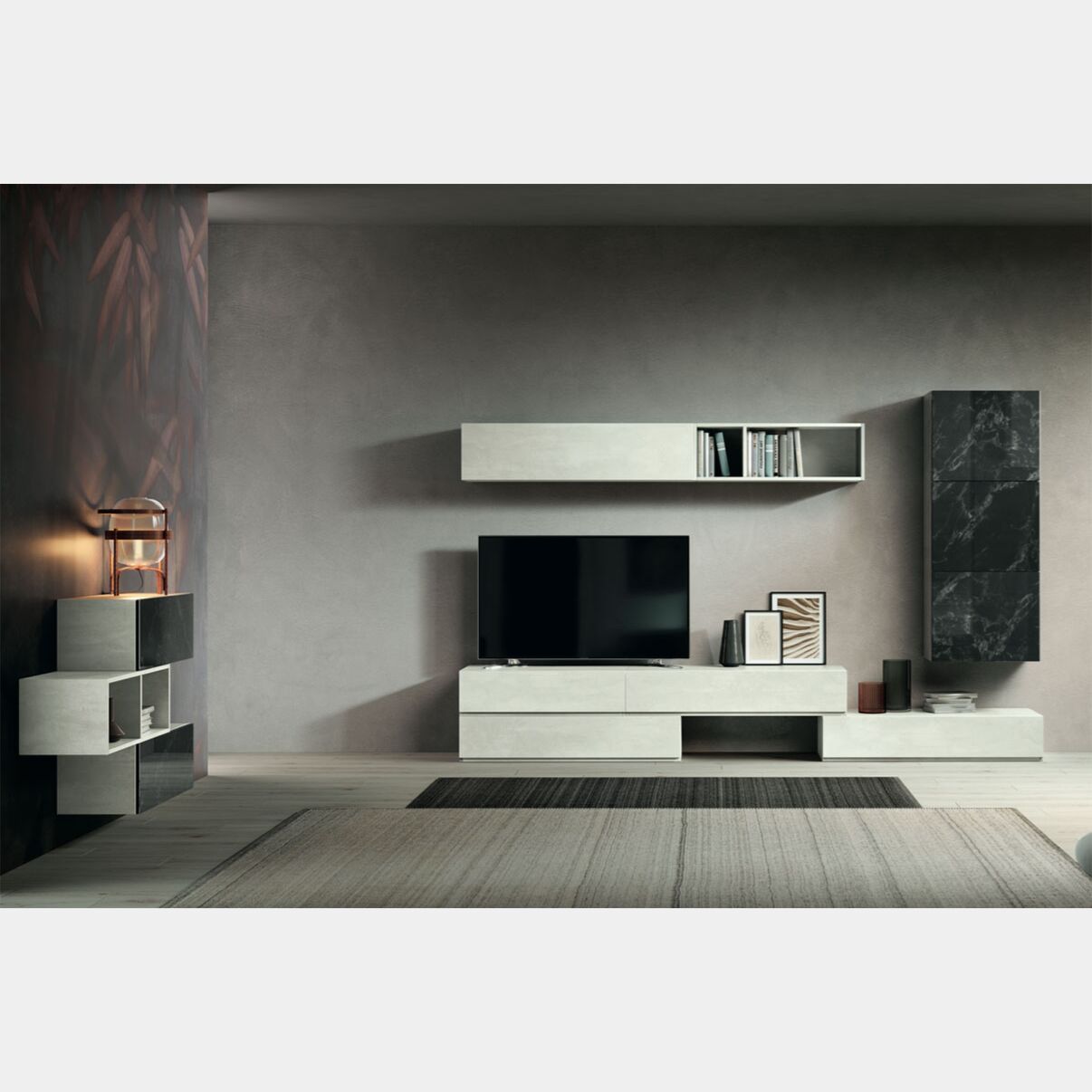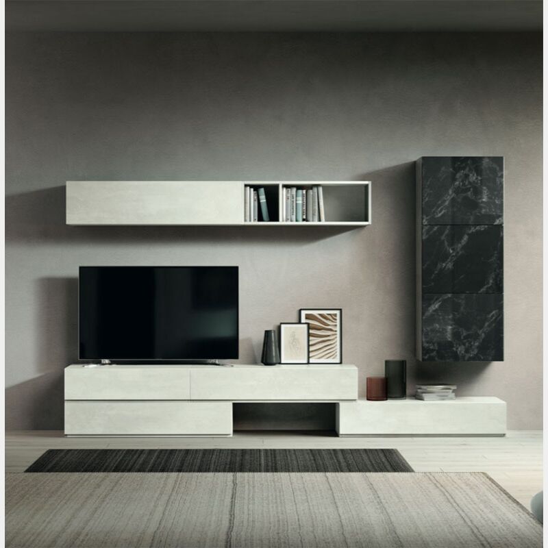 La parete è composta da una base porta Tv con 4 cassetti, un pensile sospeso, un elemento a giorno e un pensile orizzontale con apertura vasistas.