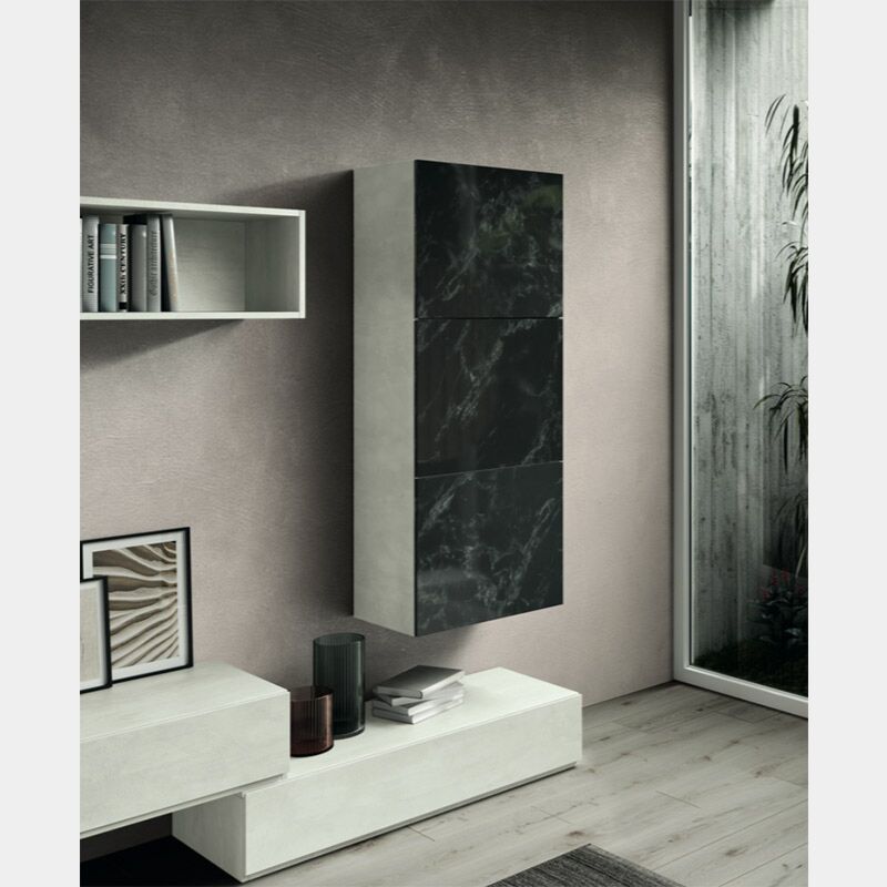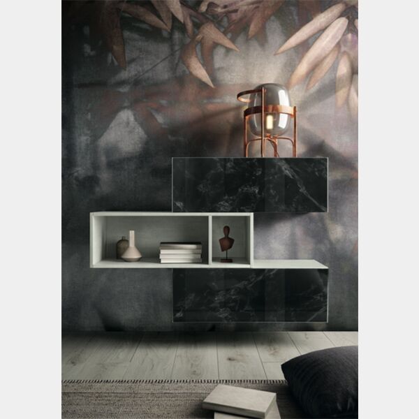 Soggiorno moderno Bozzolo in finitura Bianco calce e Vetro marmo dark. Moderno, innovativo ed elegante è la giusta soluzione per un arredo unico e personalizzato. Il soggiorno è composto da una parete attrezzata e una madia sospesa. E' un Made in Italy di alta qualità, i pannelli hanno uno spessore di 1.8, l'apertura delle ante sono push and pull mentre i cassetti sono dotati di sistema con chiusura rallentata.