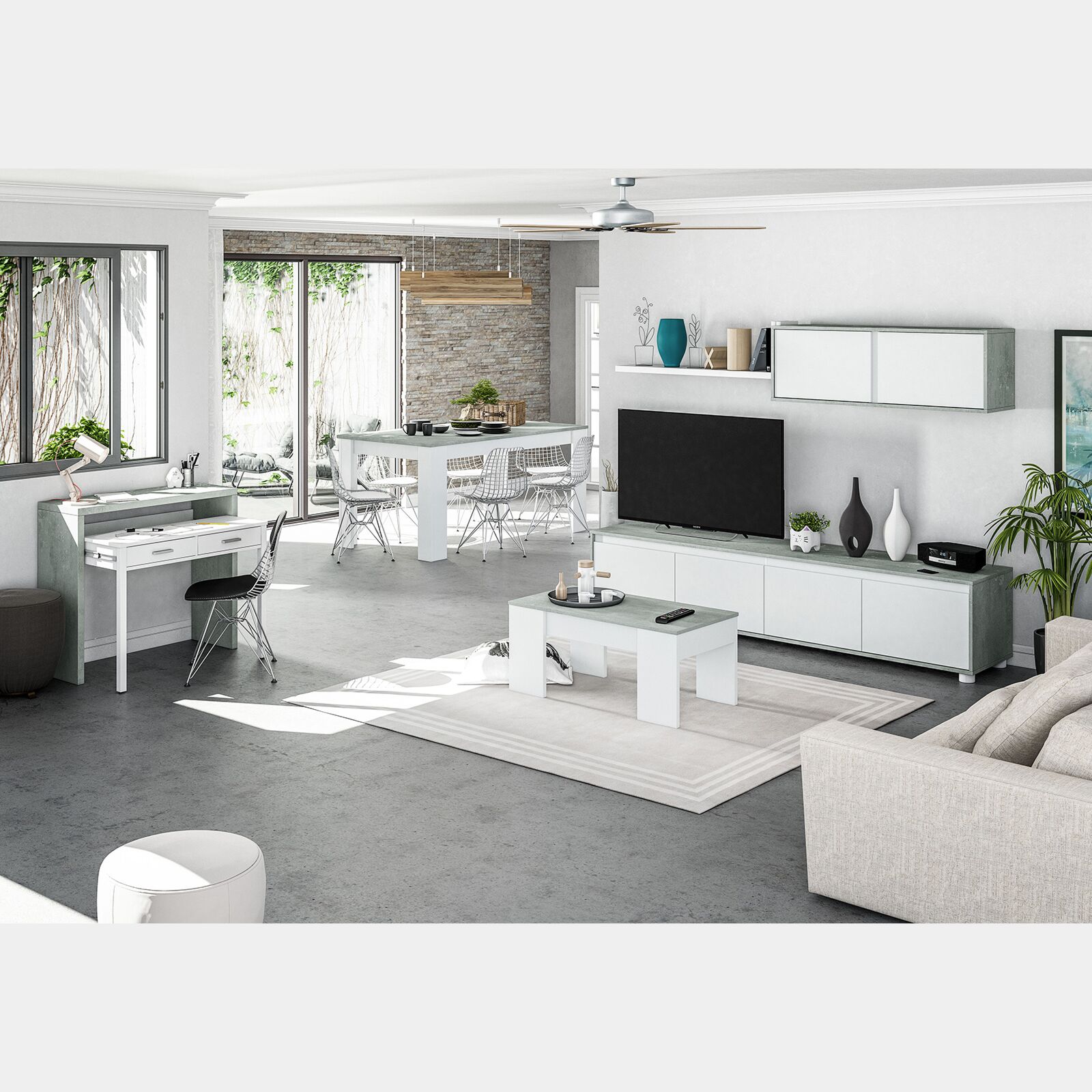 Soggiorno moderno completo con Tavolo, Parete attrezzata, scrittoio e tavolino, finitura Cemento e Bianco