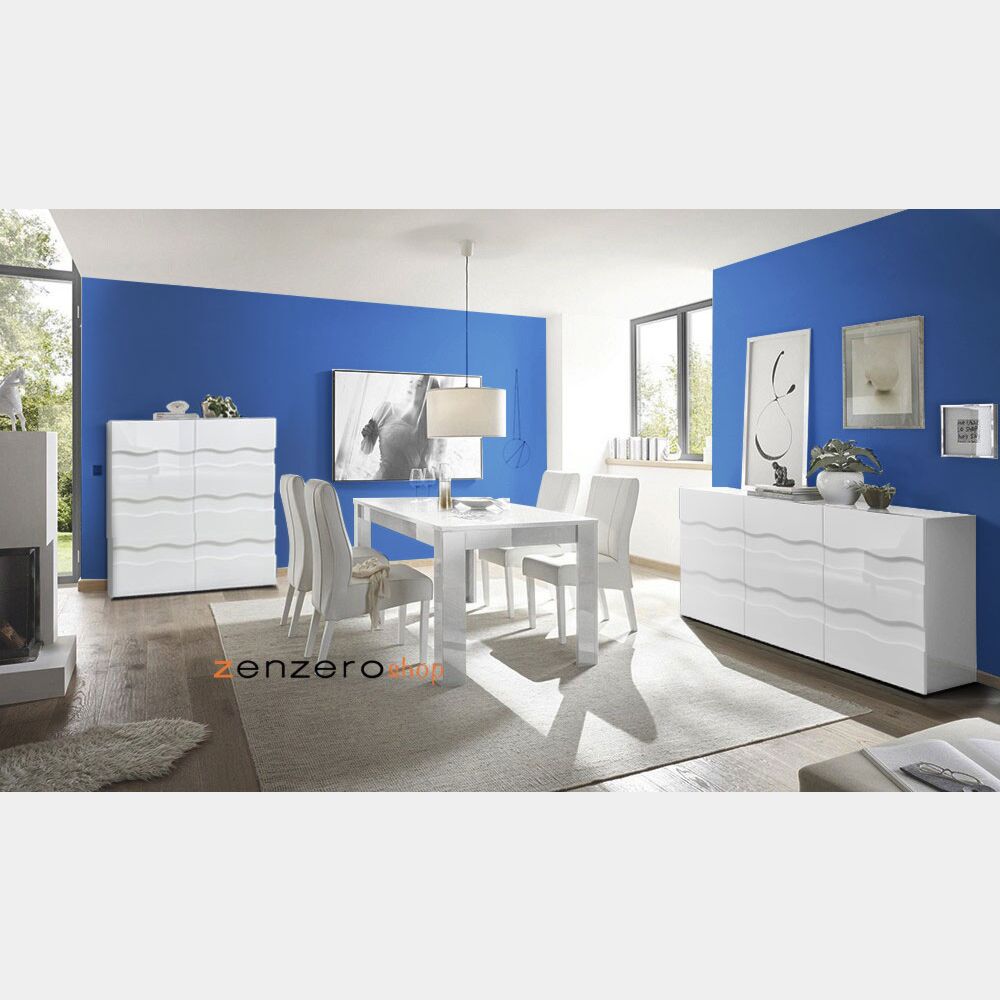 Soggiorno moderno completo di 2 Madie Onda e Tavolo bianco laccato lucido
