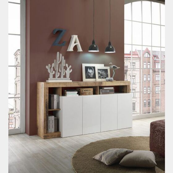 Soggiorno moderno composto da una una madia a 4 ante, una madia alta a 2 ante e un porta tv con ribalta. Questo soggiorno è l'ideale per chi è alla ricerca di un arredo particolare e ricercato. Grazie alla finitura in bianco laccato lucido e pero si abbina a diversi tipi di ambienti, il suo design dalla forma geometrica darà alla tua casa un tocco unico!