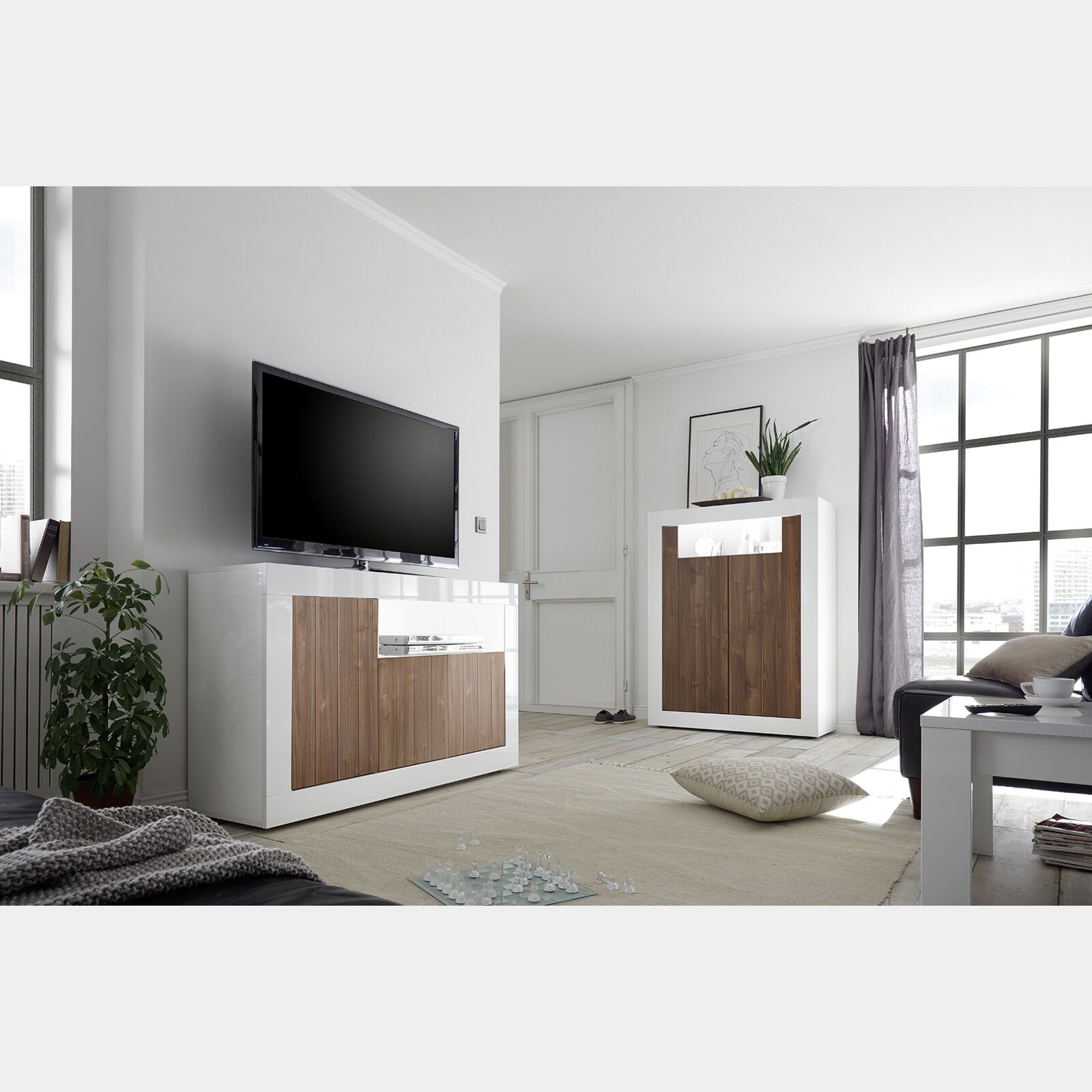 Soggiorno moderno composto da Madia porta tv e Madia Alta, finitura Bianco Lucido e Noce Dark