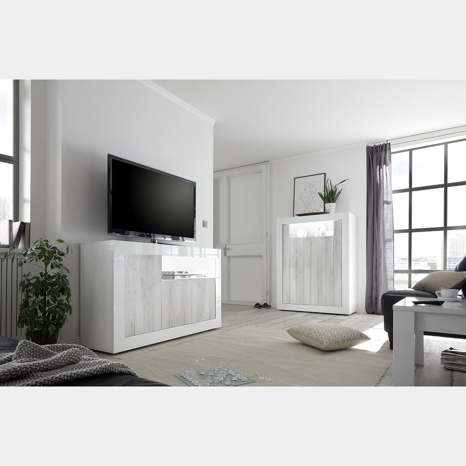 Soggiorno moderno composto da Madia porta tv e Madia Alta, finitura Bianco Lucido e Pino Bianco