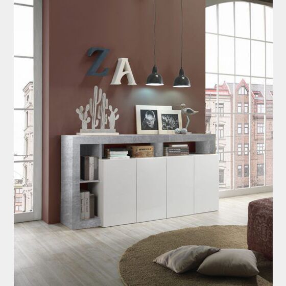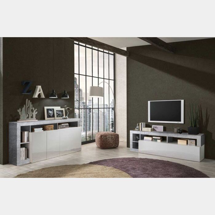Soggiorno moderno di design in finitura bianco laccato lucido e Cemento. Questo soggiorno è composto da una madia a 4 ante e un porta tv con ribalta.