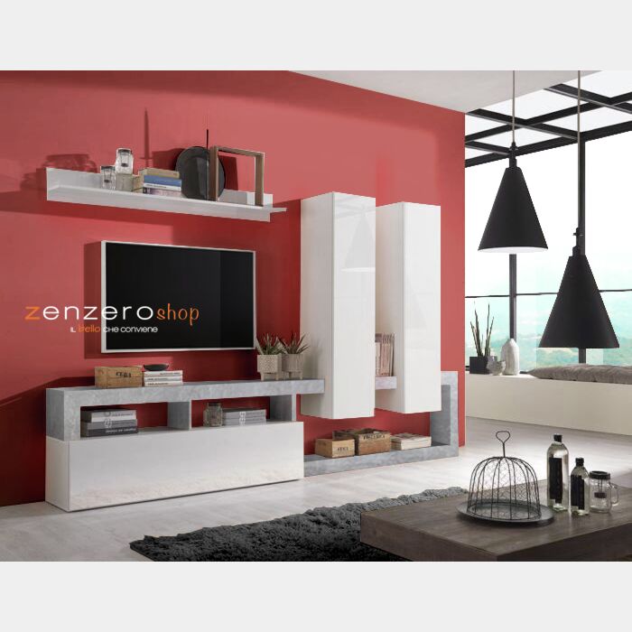 Soggiorno moderno di design in fintura bianco laccato lucido e Cemento. Questo soggiorno rende il tuo living unico e di tendenza. Grazie al suo design geometrico si adatta a tutti gli ambienti. La struttura della madia e della parete attrezzata in finitura pero crea un gioco di forme donando un ampio spazio per riporre oggetti.