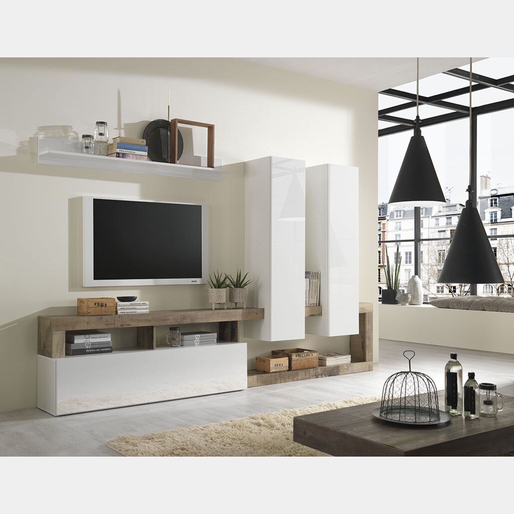 Soggiorno moderno di design in fintura bianco laccato lucido e pero. Questo soggiorno rende il tuo living unico e di tendenza. Grazie al suo design geometrico si adatta a tutti gli ambienti. La struttura della madia e della parete attrezzata in finitura pero crea un gioco di forme donando un ampio spazio per riporre oggetti.