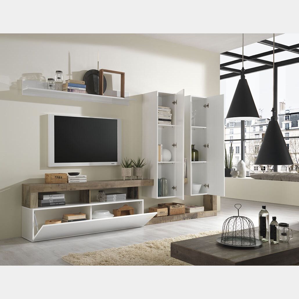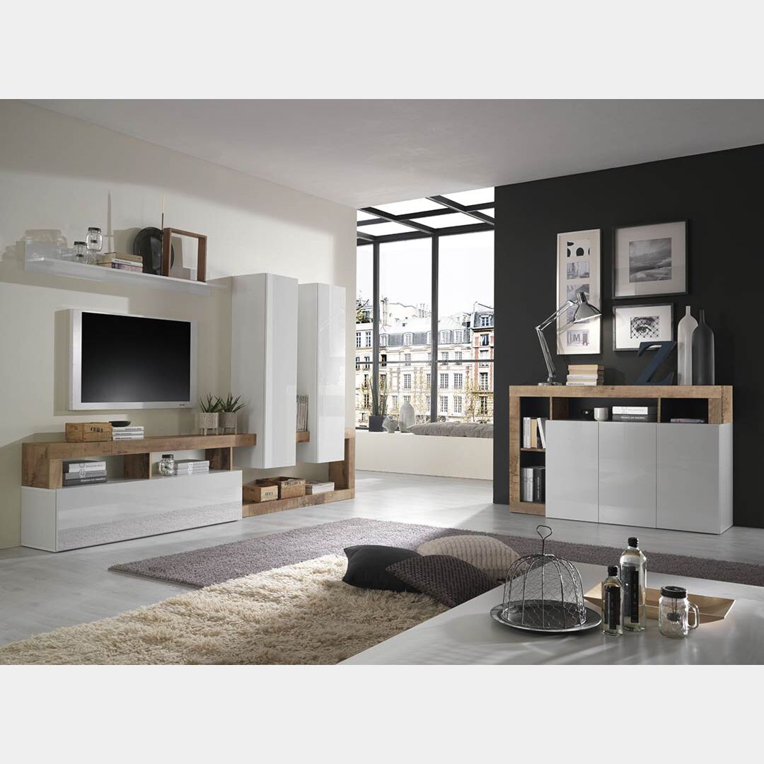 Soggiorno moderno di design in fintura bianco laccato lucido e pero. Questo soggiorno rende il tuo living unico e di tendenza. Grazie al suo design geometrico si adatta a tutti gli ambienti. La struttura della madia e della parete attrezzata in finitura pero crea un gioco di forme donando un ampio spazio per riporre oggetti.