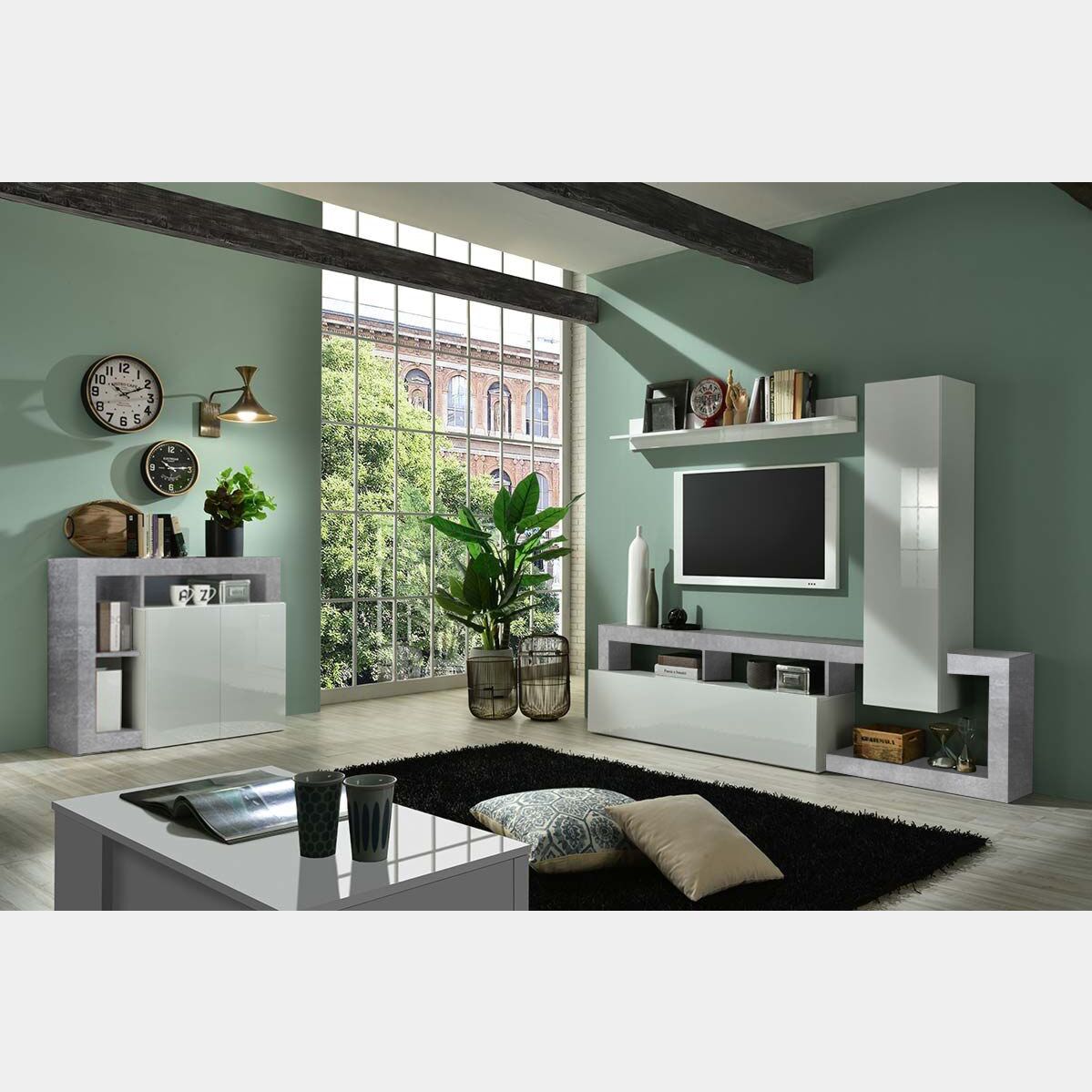 Soggiorno moderno di design composto da parete attrezzata e madia a 2 ante in finitura bianco e Cemento