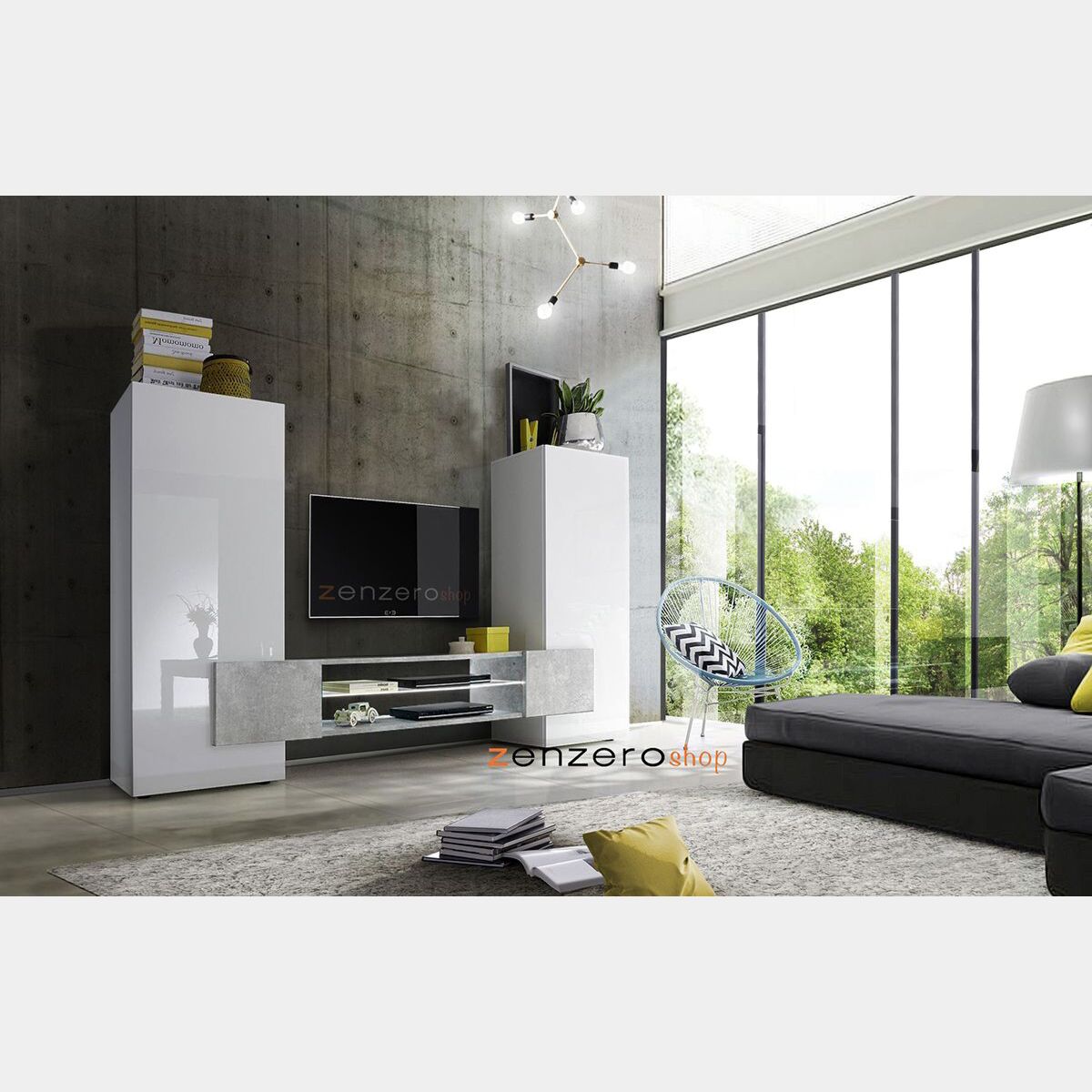 Soggiorno moderno con frontali bianco lucido con inserto in Beton, Cerniere metalliche. Mensola vetro con luce bianca optional. Vedi altri porta tv.
