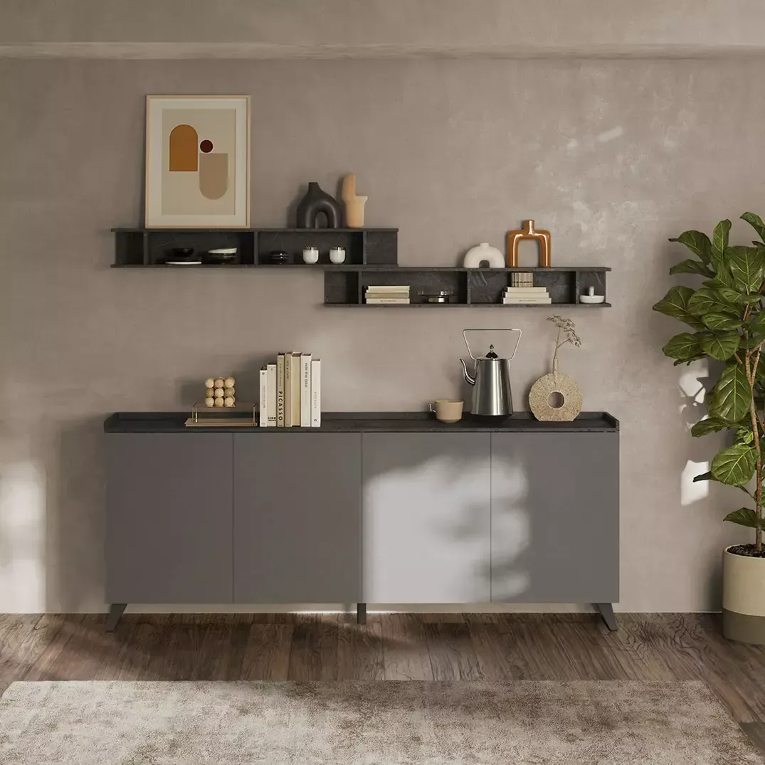 Le nuove finiture Piombo e Ardesia caratterizzano il soggiorno per offrire un arredo elegante e di tendenza. Il piacevole contrasto generato tra struttura e top di ogni mobile assicura un complemento d'arredo caratteristico e ricercato.