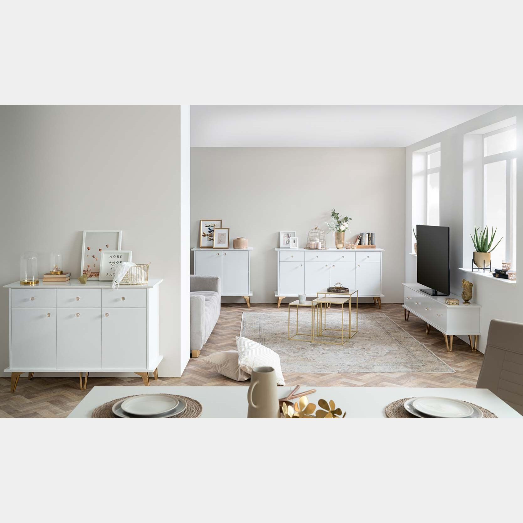 Soggiorno Oslo composto da 3 madie e un porta tv in finitura bianco e oro
