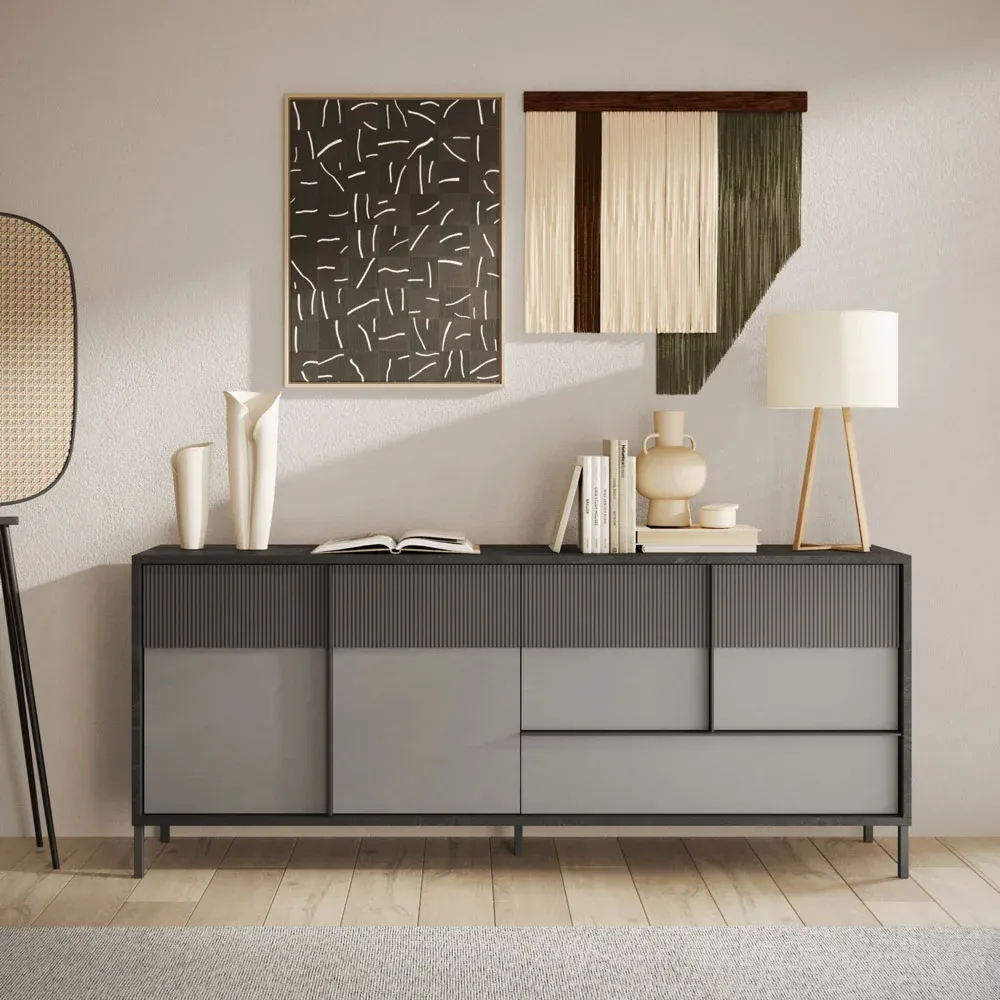 - Da una madia, formata a sua volta da due cassetti e da quattro ante. Il suo punto di forza è di essere capiente per inserire i propri oggetti in un luogo ordinato e ben strutturato. La serigrafia cannettata è un elemento caratteristico che la rende ancora più unica.