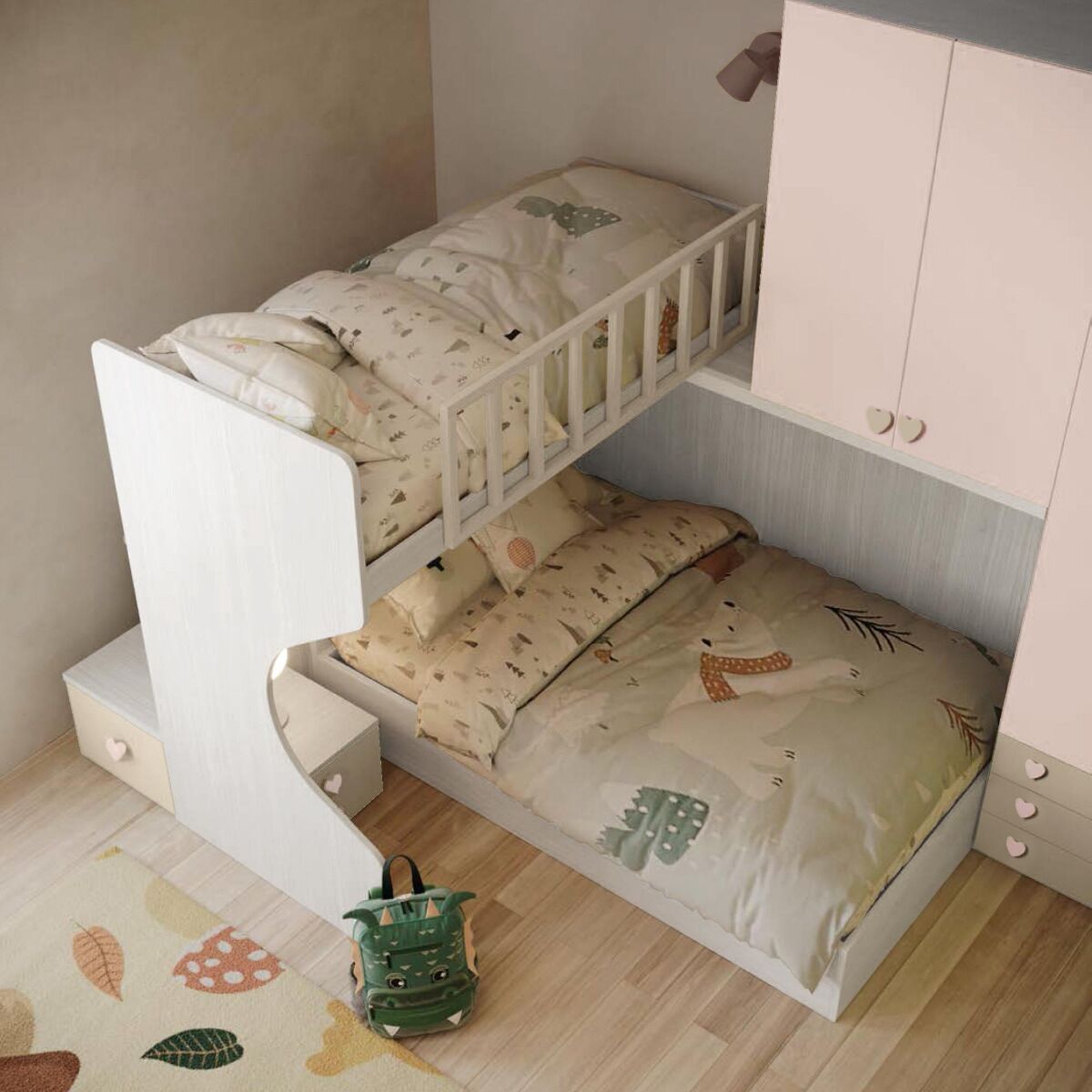 Soppalco angolare con letto piazza e mezza contenitore, finitura Rosa antico, Visone e Bianco frassino