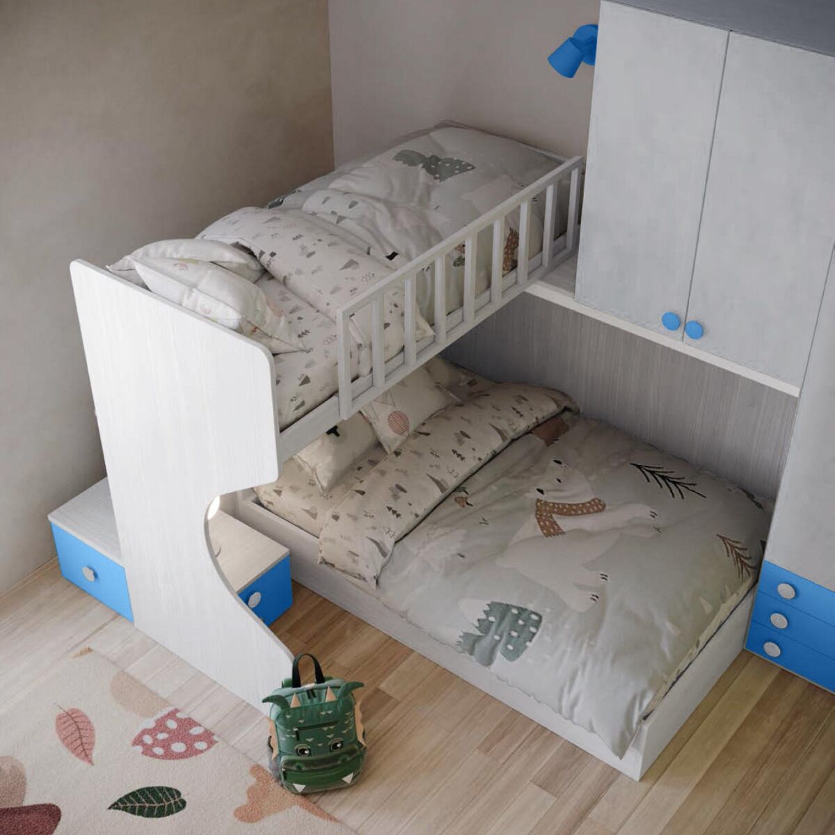 La cameretta con soppalco angolare è composta da un letto singolo superiore con protezione, una scaletta con cassettoni, un modulo a 2 ante sospeso ed un modulo a 2 ante con 3 cassetti inferiore.