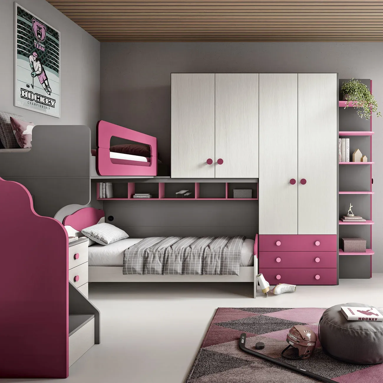La cameretta è composta da un posto letto singolo superiore, raggiungibile tramite scaletta a 3 cassetti e rialzo, un letto singolo inferiore, un'armadiatura a 4 ante battenti (con tubo appendiabiti) e 3 cassetti ed un modulo terminale con libreria ed anta battente, al cui interno sono presenti 5 ripiani.