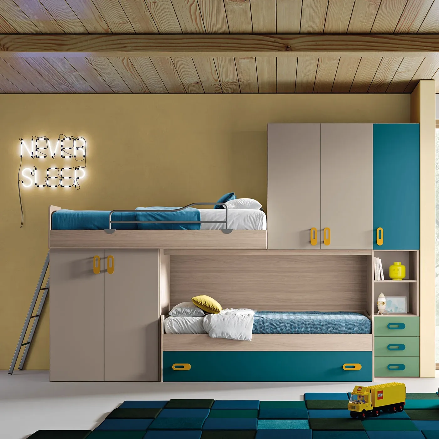 Soppalco con 3 letti, finitura Olmo, Talco, Ocean e Verde papua