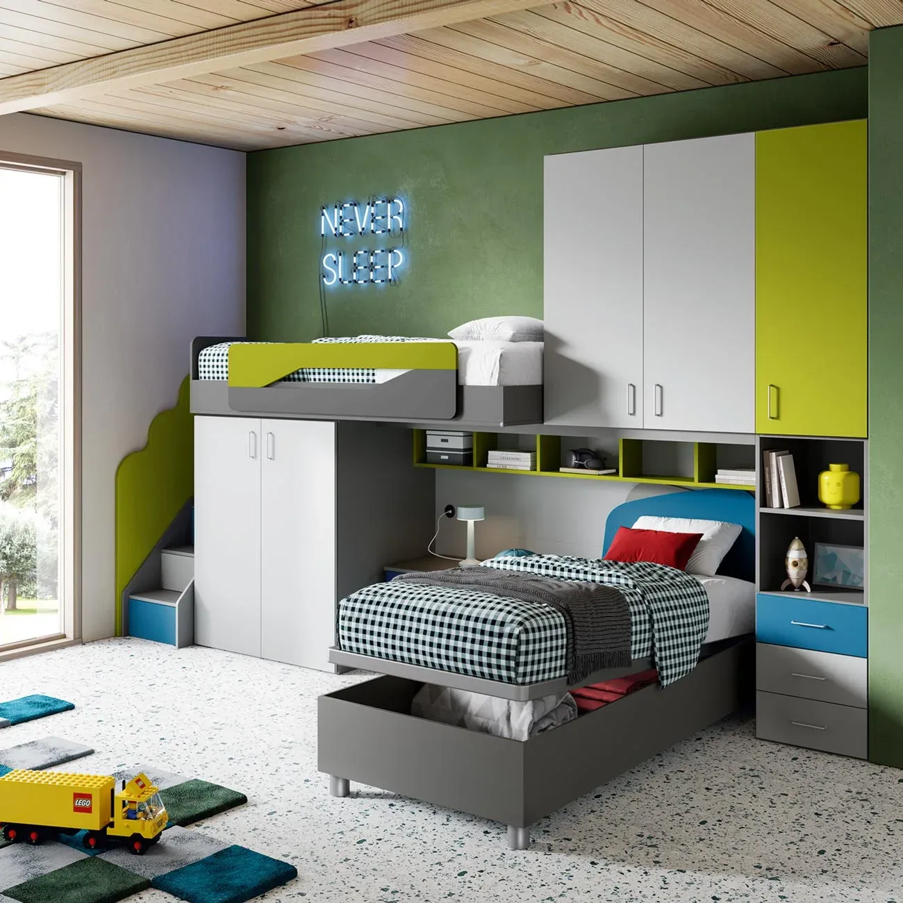 Il letto inferiore singolo presenta un capiente box contenitore, perfetto per riporre giochi, coperte e biancheria da letto. Tramite configuratore è possibile richiedere il comodino, il corrimano e la libreria sottoponte.