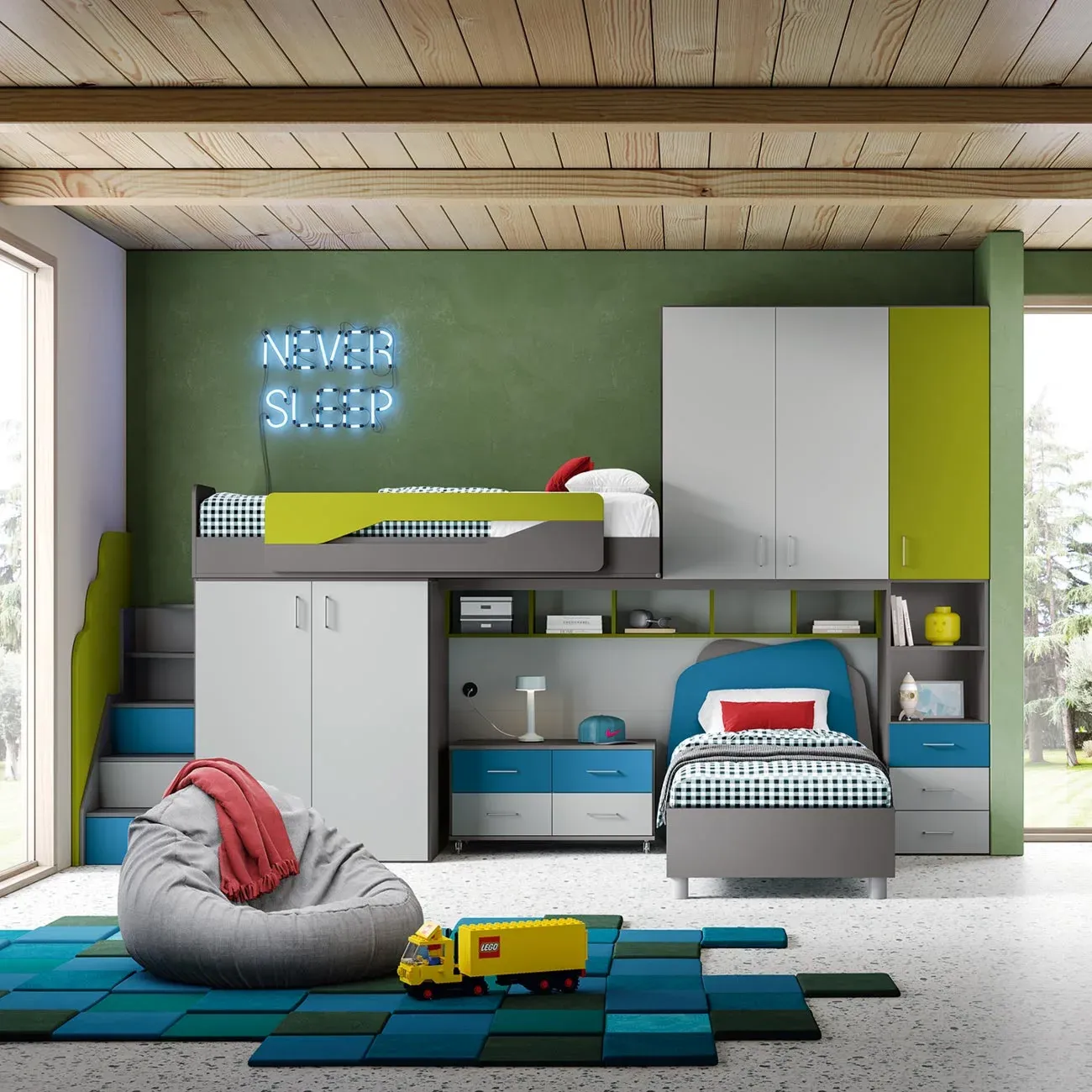 Progettata per sfruttare al meglio lo spazio il soppalco offre due pratici posti letto assicurando al contempo un notevole spazio per riporre vestiti, coperte e giochi.