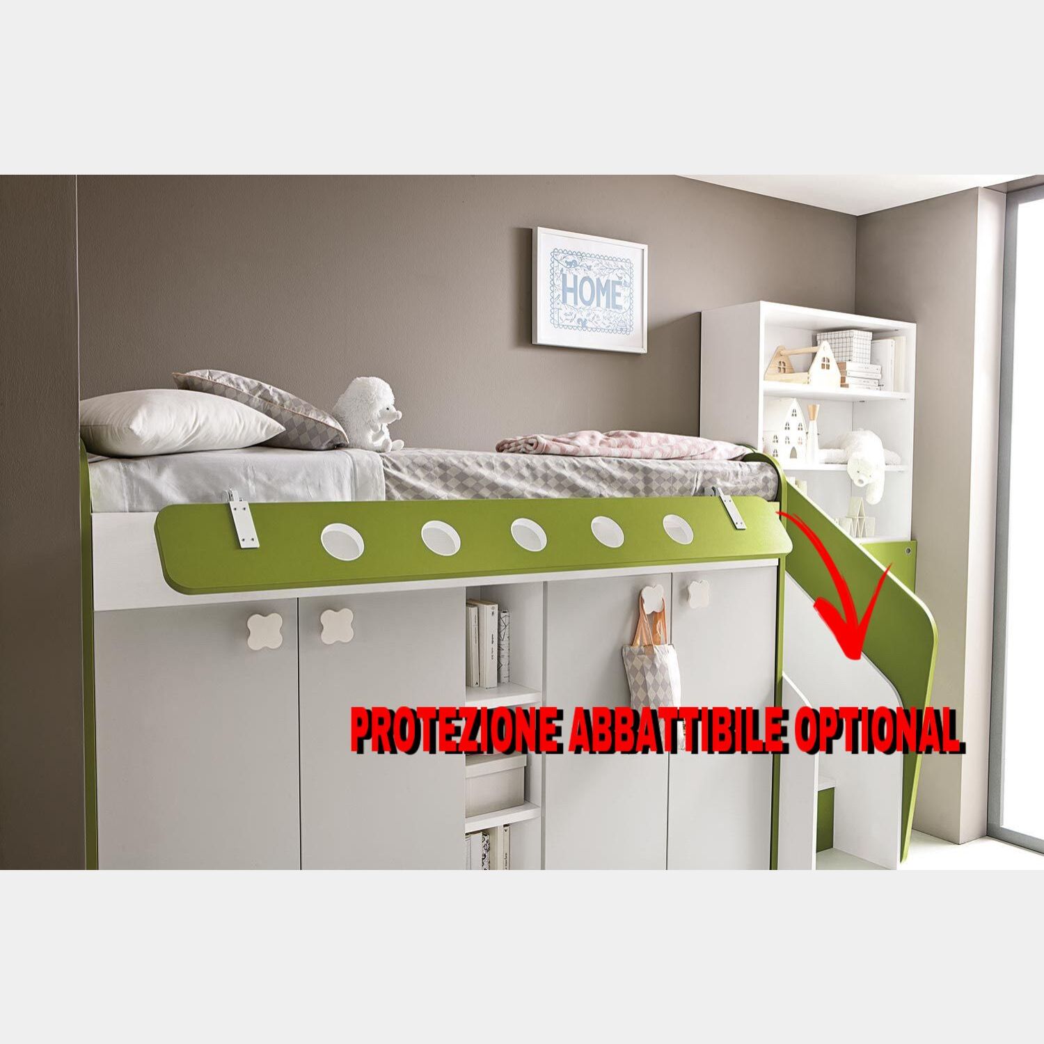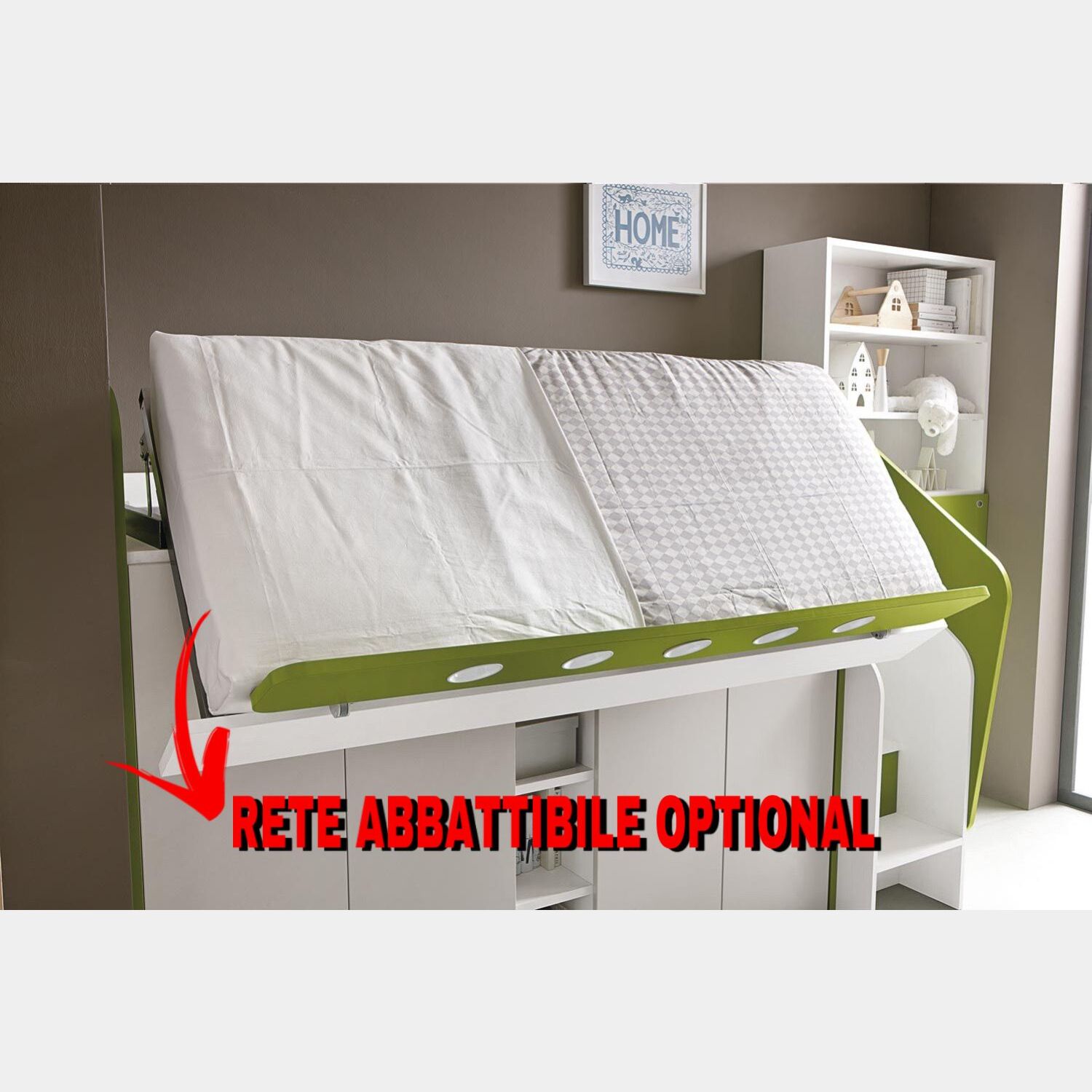 Per facilitare la mamma nel rifacimento del letto superiore è possibile richiedere, tramite configuratore, la rete abbattibile con protezione adatta. Questo meccanismo consente al letto superiore di scendere per consentire facili e veloci movimenti a chi rifà il letto, senza dover salire nella scaletta.