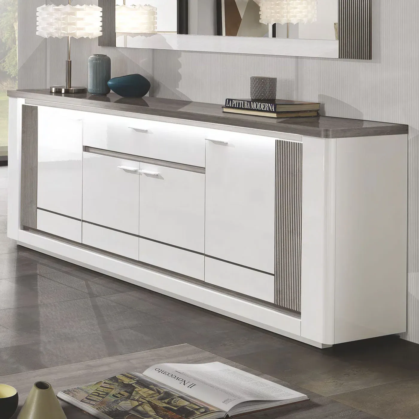 Vuoi inserire un nuovo mobile nel tuo soggiorno per renderlo più raffinato e di tendenza? Questa madia fa al caso tuo. E' costituita da quattro ante battenti e da un cassetto, in finitura Rovere Adamello e Bianco laccato lucido.