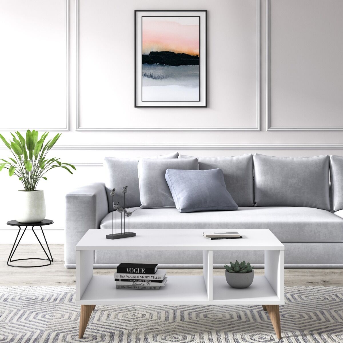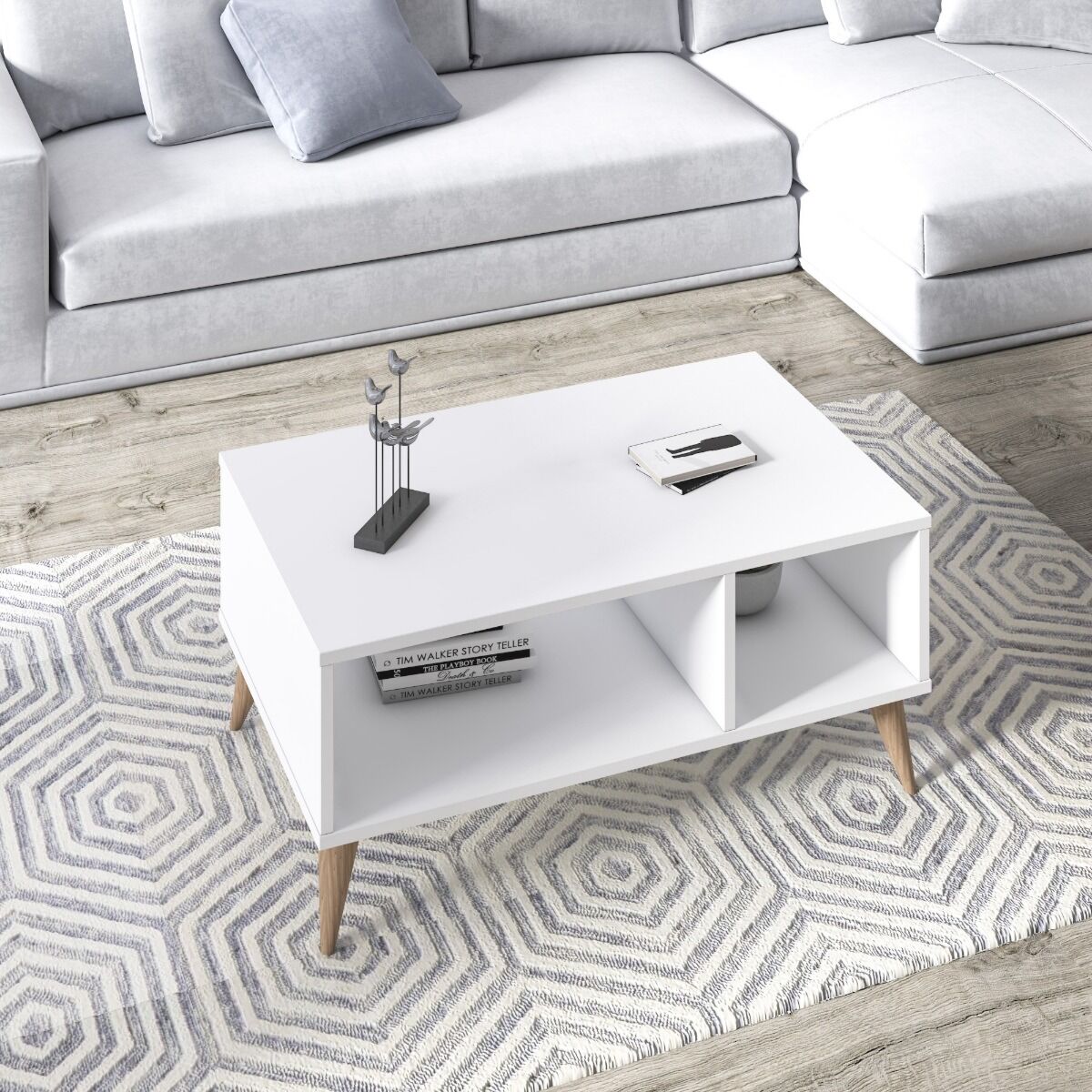 Il tavolino Ankara è dotato di un divisorio centrale che crea 2 vani di appoggio. Il tavolino è disponibile anche nella versione completamente in Rovere. La sua finitura in bianco dona luce e calore all'ambiente, il leggero contrasto con i piedini lo rende personale e ricercato.