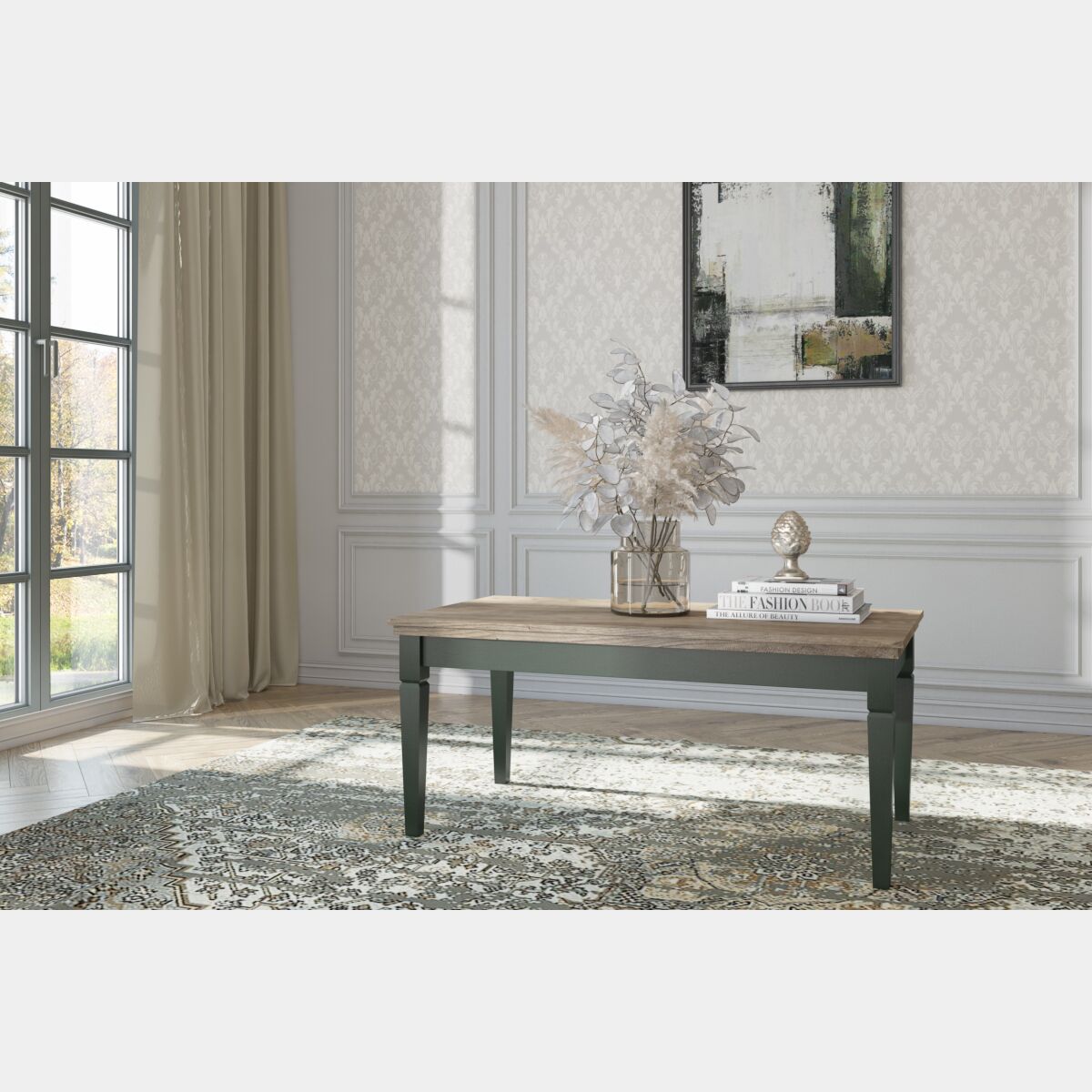 Tavolino basso da salotto finitura verde scuro e quercia, è una proposta dalla grande personalità, capace di mixare lo stile classico al moderno e ti consentirà di avere sempre tutto a portata di mano mentre ti rilassi nella zona tv.