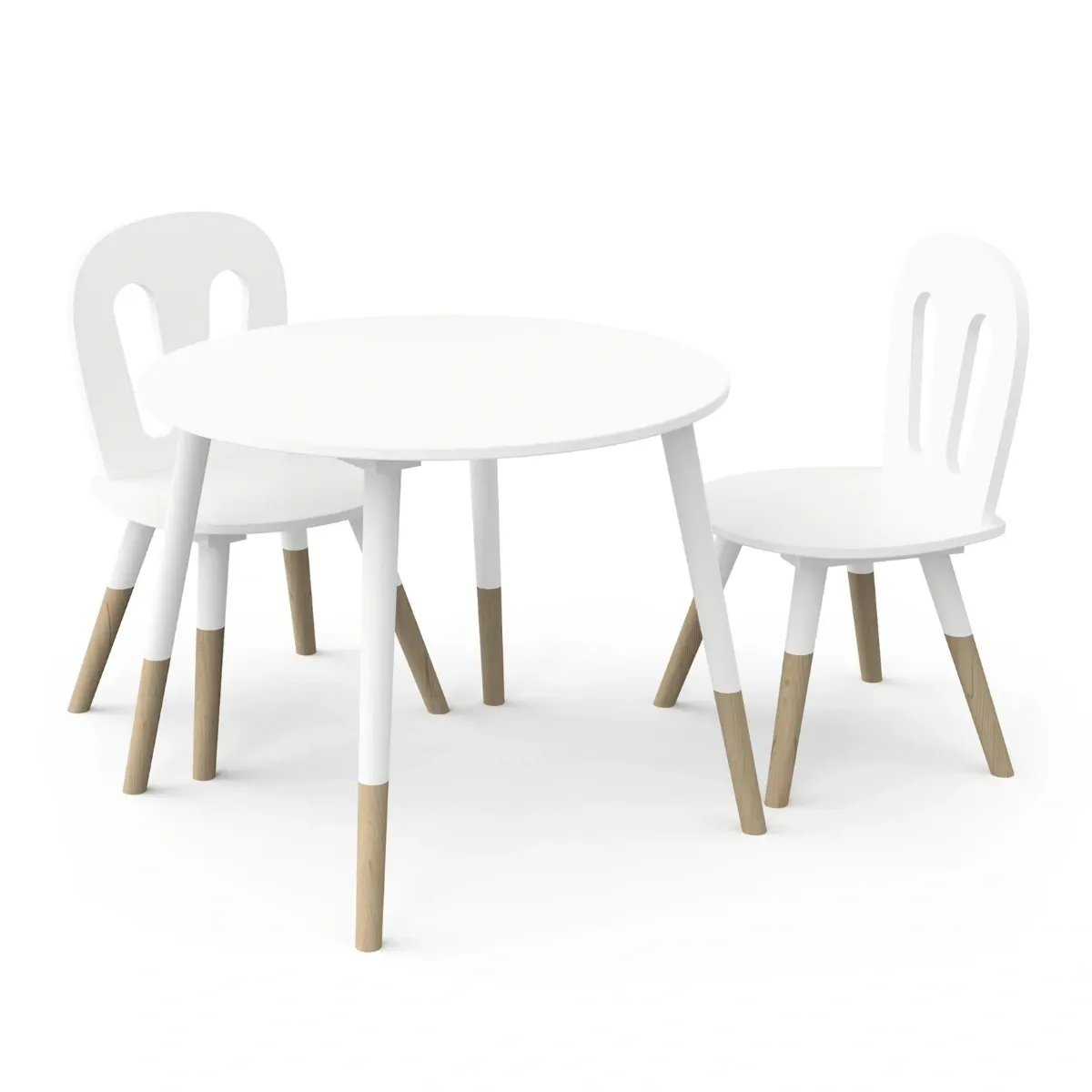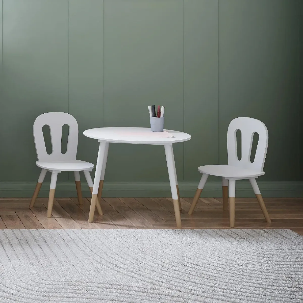 Le due comode sedie, in tinta con il tavolino, presentano un design moderno e allegro, per assicurare all'ambiente un tocco personale, a misura di bambino.