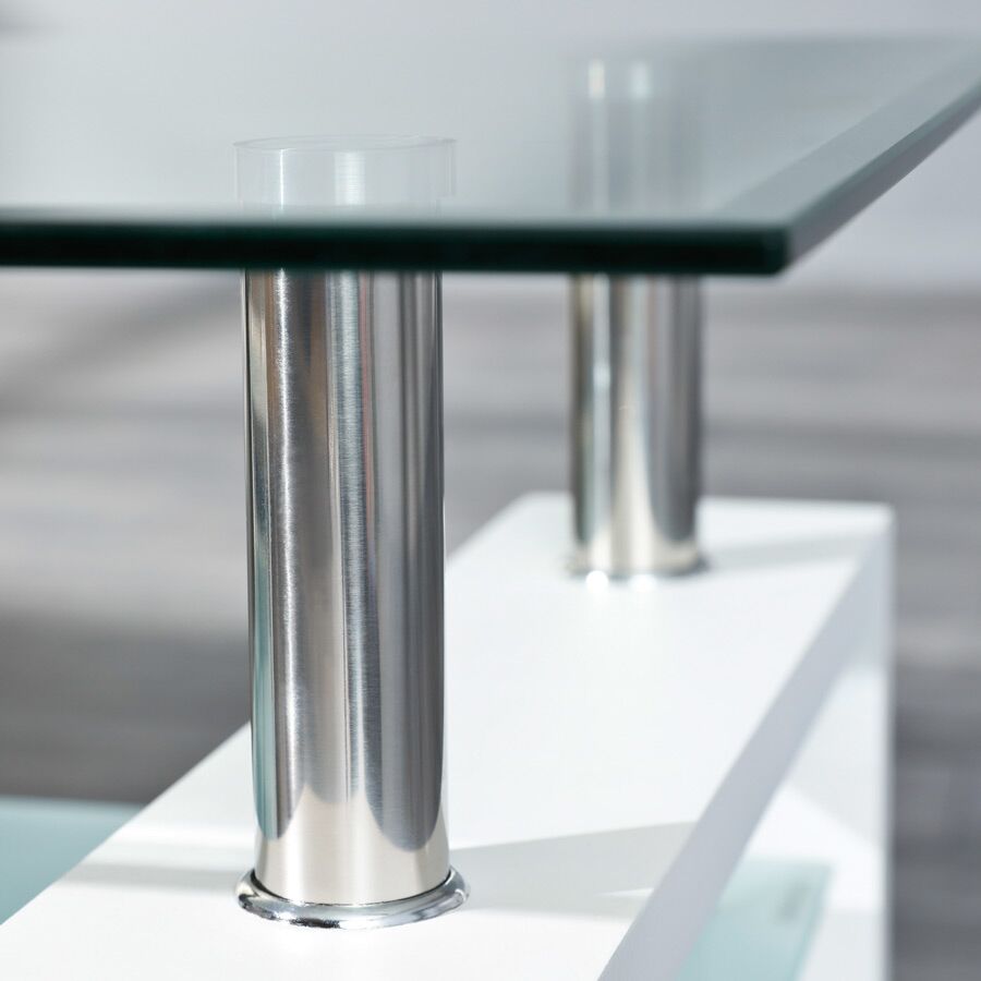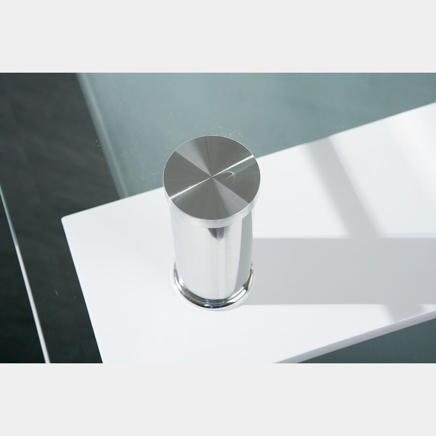 Mdf laccato bianco, doppio vetro temperato e metallo cromato.